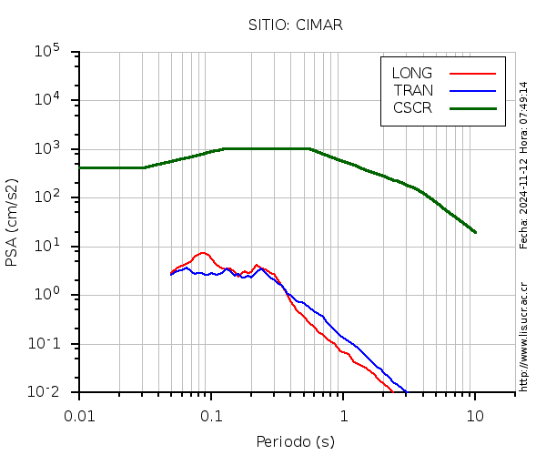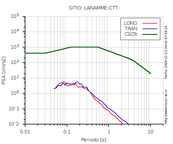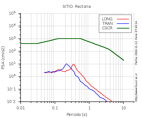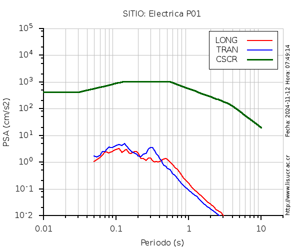 En los siguientes gráficos, la traza verde es el espectro propuesto por el CSCR-2010, la traza roja es el espectro de este sismo en la componente LONGITUDINAL y la traza azul la componente TRANSVERSAL. El valor de la amplitud está dado en pseudoaceleración en gales ó cm/s2.