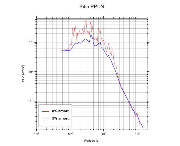 La forma en que un edificio se comporta cuando es sometido a un sismo depende de varios factores entre ellos: - Magnitud del sismo - Duración de la sacudida - Factores dinámicos propios de la estructura - Efecto de amplificación del suelo sobre el cual se asienta la construcción. - Contenido frecuencial de la señal La sacudida del inmueble será mayor si este y el sismo vibran a una misma frecuencia (en un fenómeno que se llama resonancia). Además de esos factores, el edificio mismo ofrece cierta resistencia a la vibración impuesta que se refleja en un porcentaje llamado amortiguamiento. Las construcciones civiles generalmente poseen niveles de mortiguamiento en el rango de 2 a 7% y para edificaciones normales, se asume que es de 5%. De esta manera, la forma de los espectros de diseño esta íntimamente ligada a la zona sísmica y el tipo de suelo donde se ubican las construcciones. Uno de los principales usos de los datos acelerográficos es precisamente para calcular dichos espectros y en este caso se presentan los mismos para cada estación acelerográfica solo en la componente NS para el 0% y 5% de amortiguamiento. |