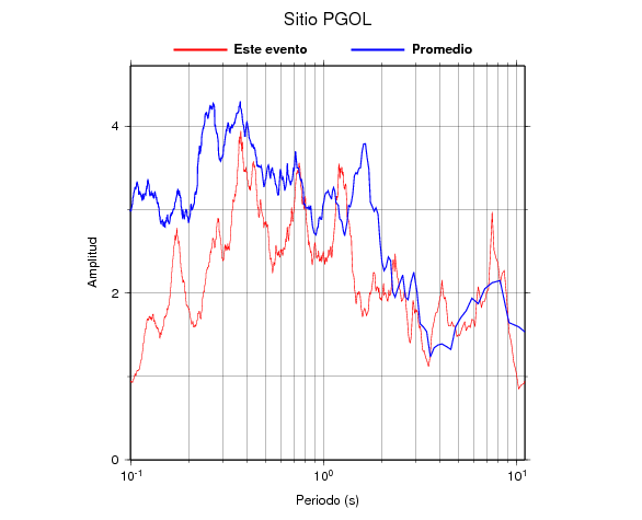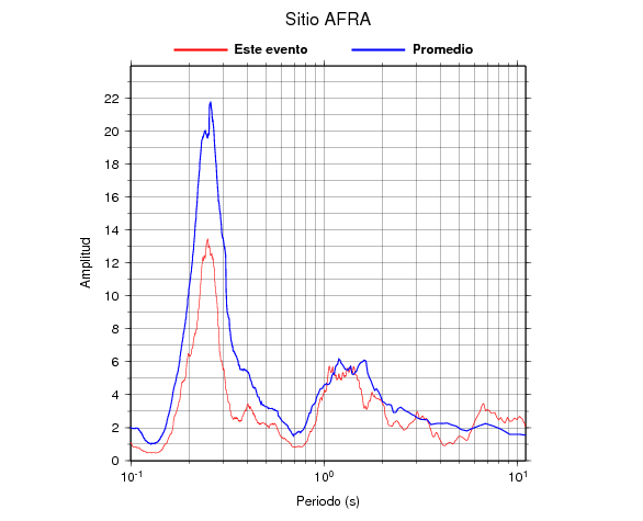 mayores a 0.4 s). En este informe se grafica tanto el efecto de sitio del sismo registrado como el valor promedio en cada estación. El ajuste no debe ser exacto ya que el valor promedio es más representativo de la respuesta del suelo que un solo evento. Sin embargo, se deben notar características generales como máximos y mínimos de amplificación aproximadamente en los mismos valores de período. |
