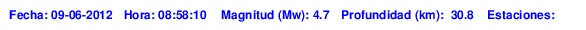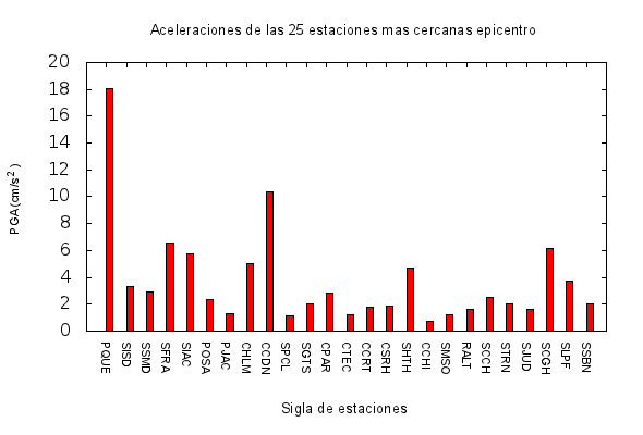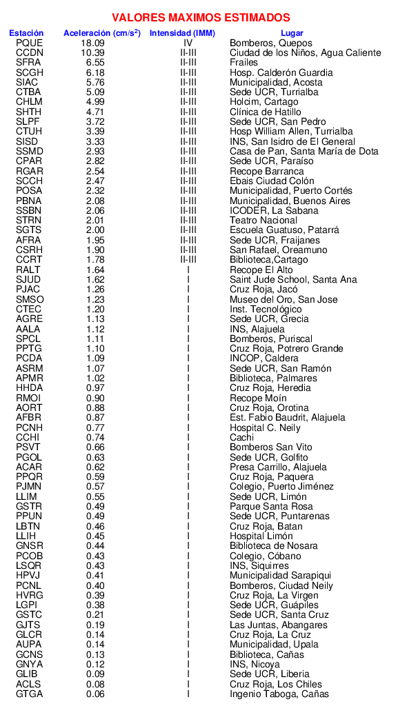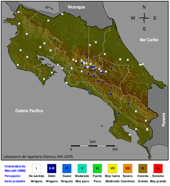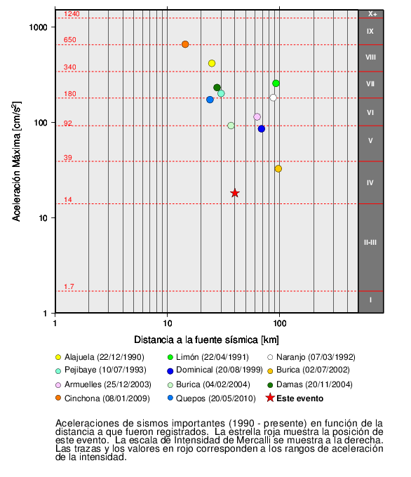 La intensidad es una medida de la fuerza con que un terremoto golpea una zona y se cuantifica en base en los daños que se producen.  Existe una relación entre la Intensidad Modificada de Mercalli (ver cuadro abajo), la aceleración y la velocidad máximas que se obtienen de los registros acelerográficos y es denominada INTENSIDAD INSTRUMENTAL. Esa relación se usa para generar el mapa de arriba en forma automática.  La escala original puede ser consultada en el sitio Web del Servicio Geológico de Estados Unidos en  http://earthquake.usgs.gov/eqcenter/shakemap.