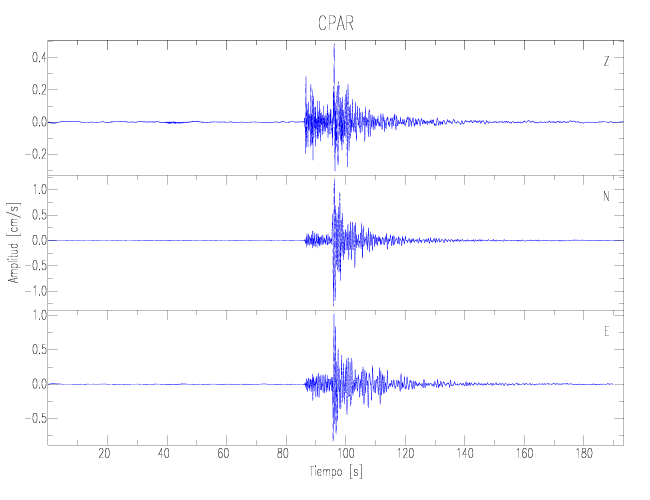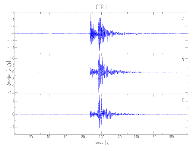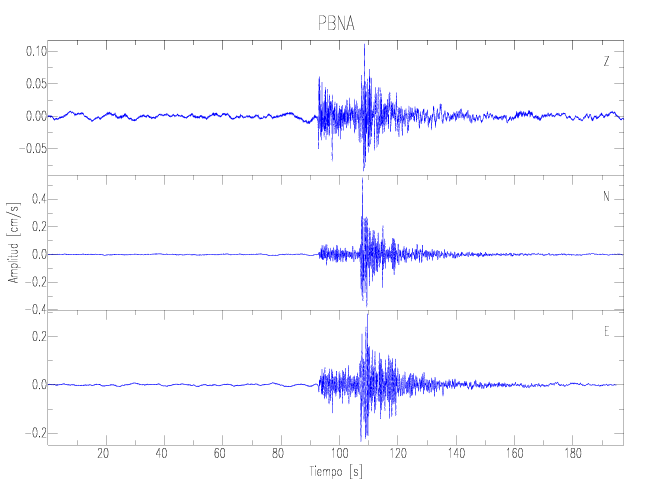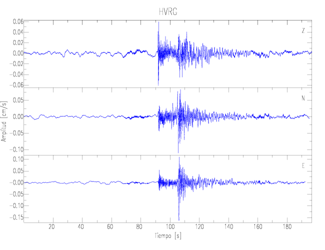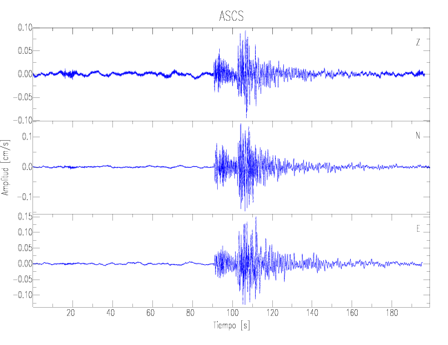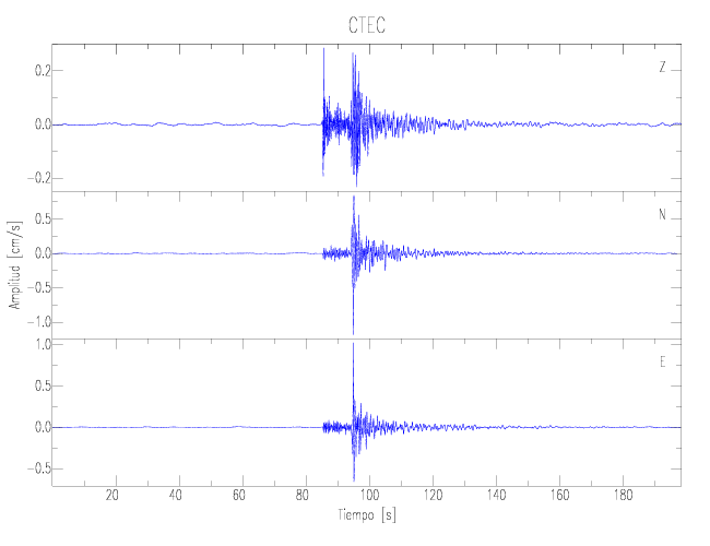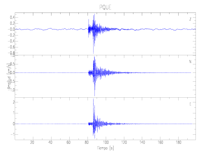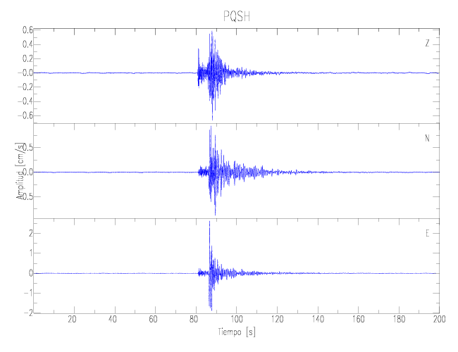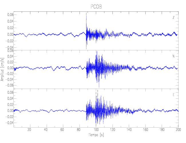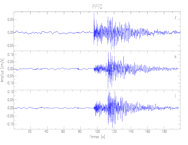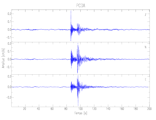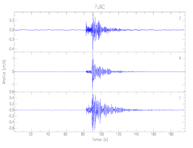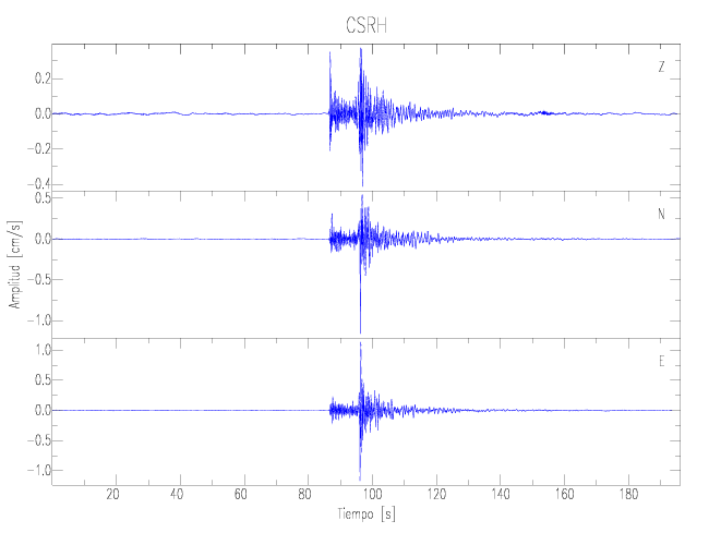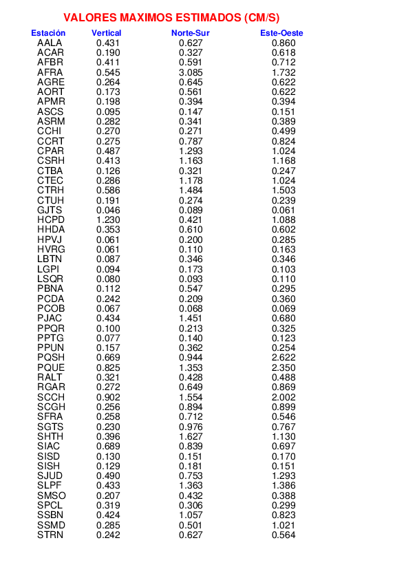 En este mapa se muestran los valores de velocidad máxima alcanzada por cada uno de los sitios que registró el terremoto.  En rojo se ven los valores más altos y en blanco los más bajos.  Valores intermedios se pueden ver en la escala al pie del mapa.