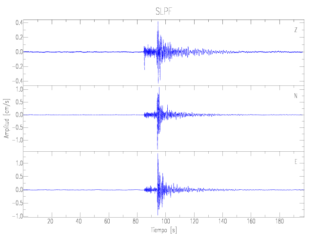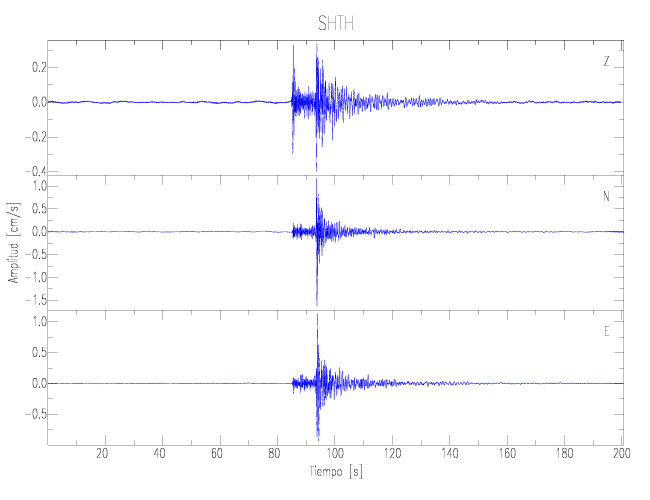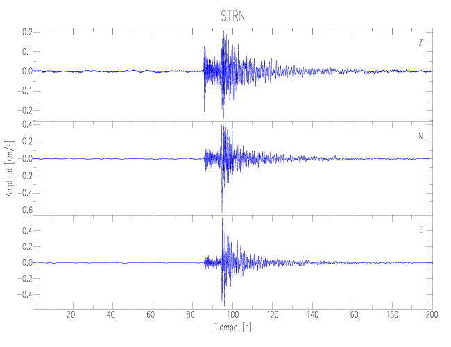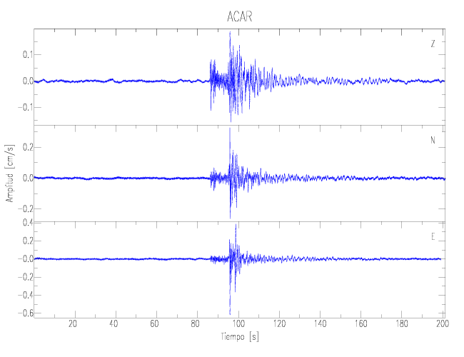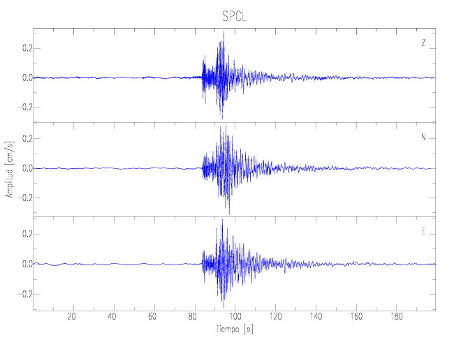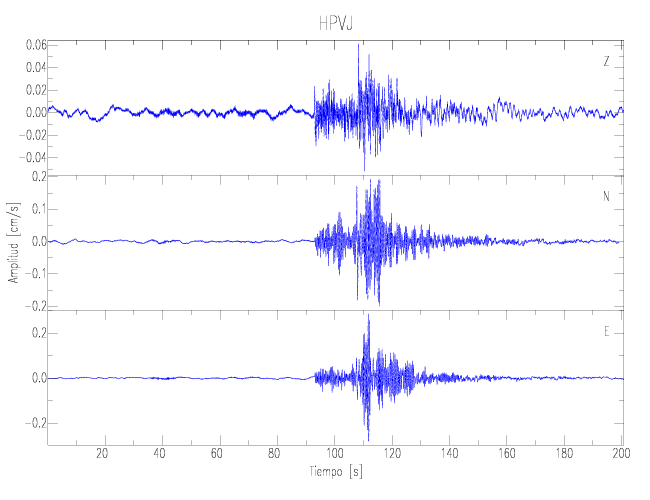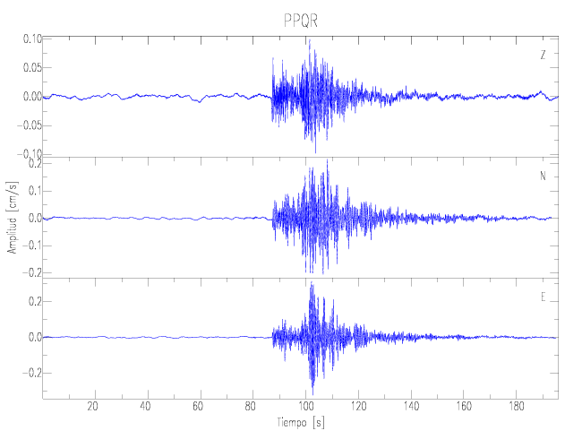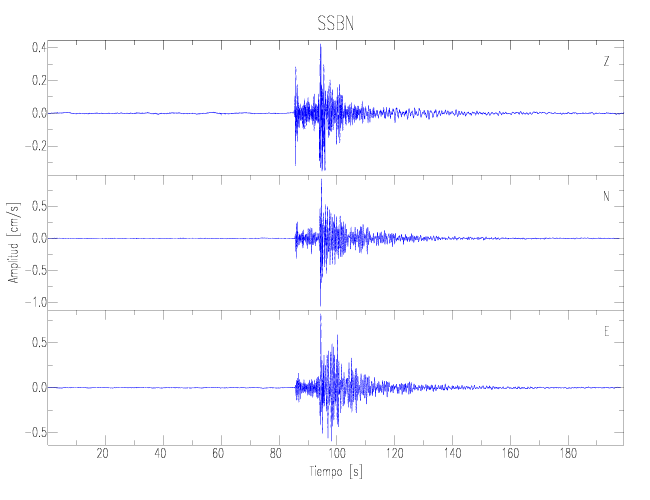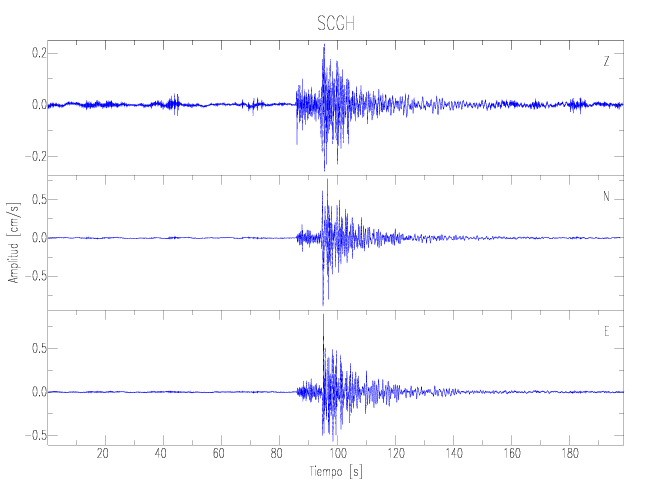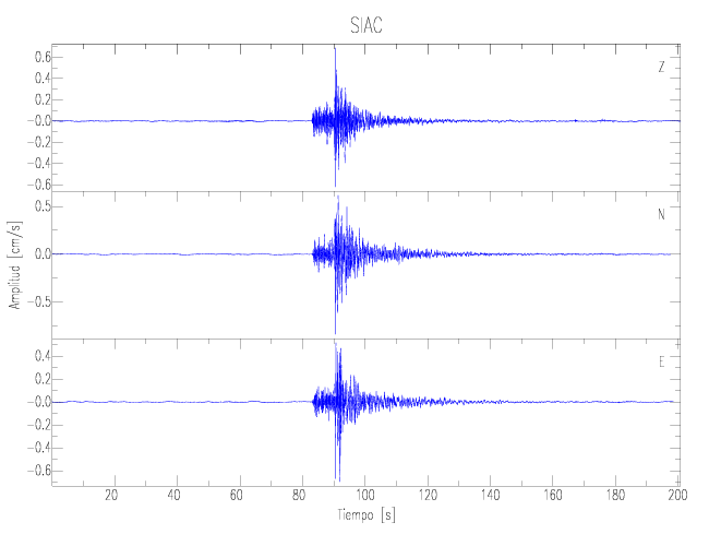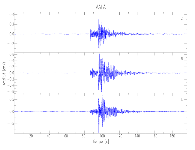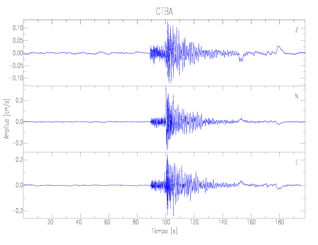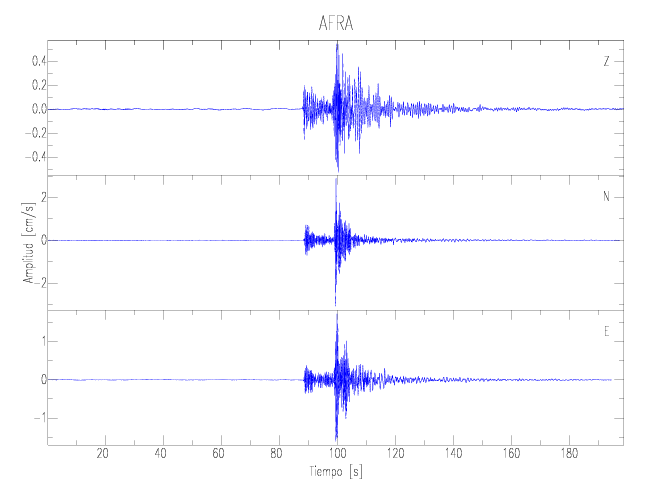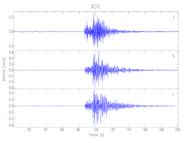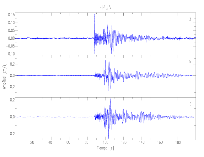 En este mapa se muestran los valores de velocidad máxima alcanzada por cada uno de los sitios que registró el terremoto.  En rojo se ven los valores más altos y en blanco los más bajos.  Valores intermedios se pueden ver en la escala al pie del mapa.