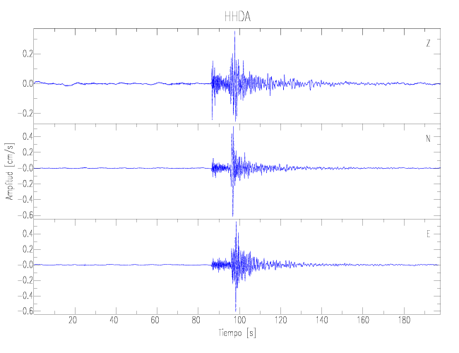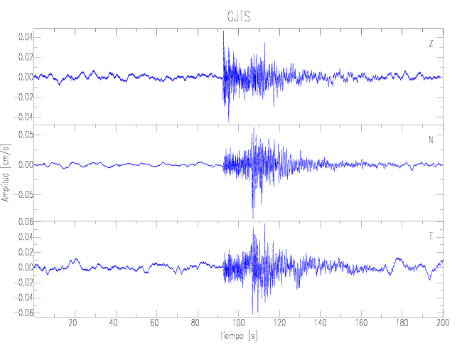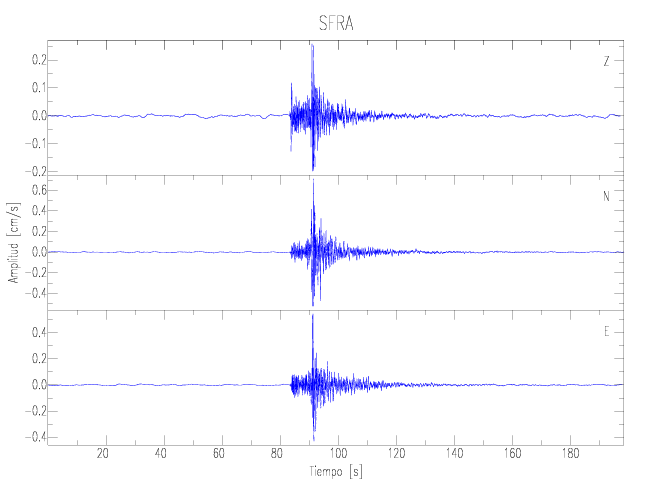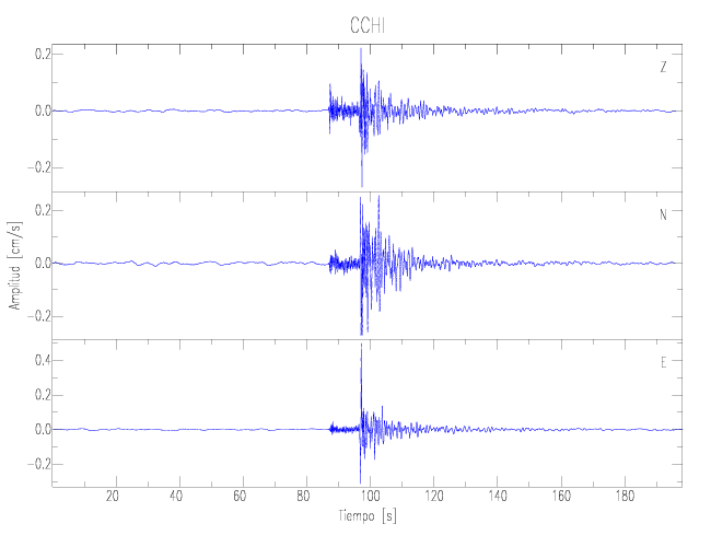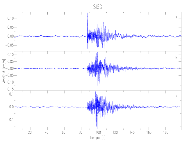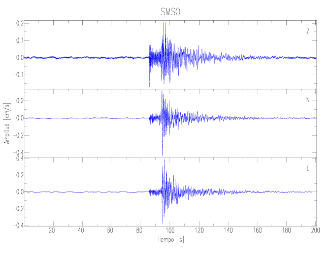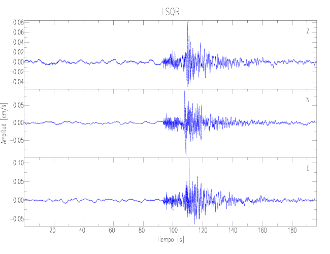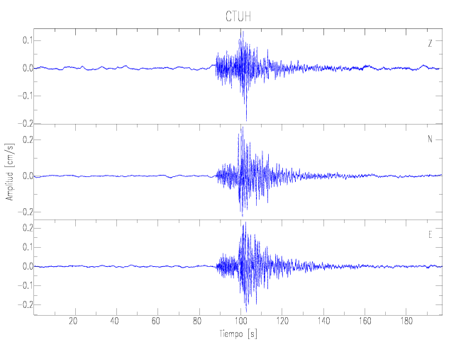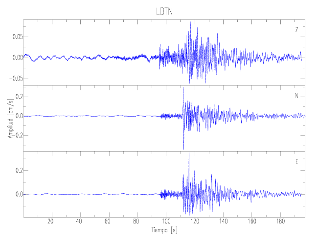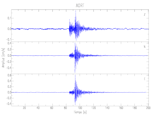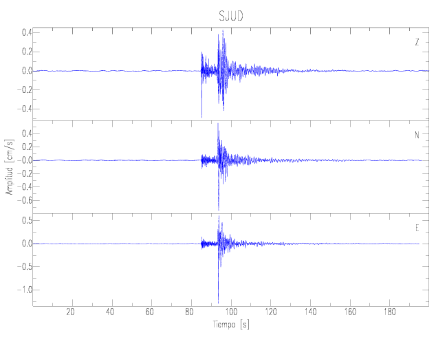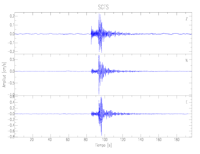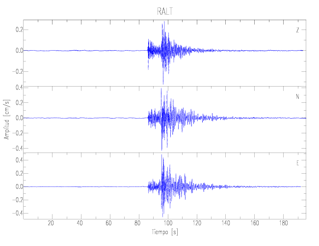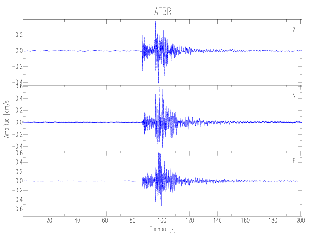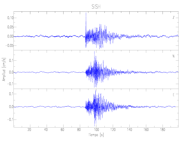 En este mapa se muestran los valores de velocidad máxima alcanzada por cada uno de los sitios que registró el terremoto.  En rojo se ven los valores más altos y en blanco los más bajos.  Valores intermedios se pueden ver en la escala al pie del mapa.