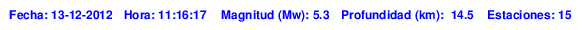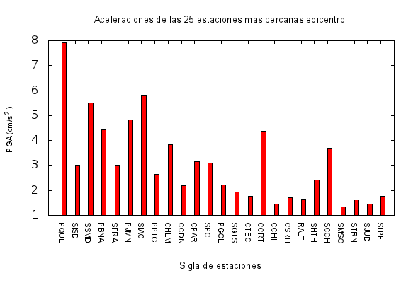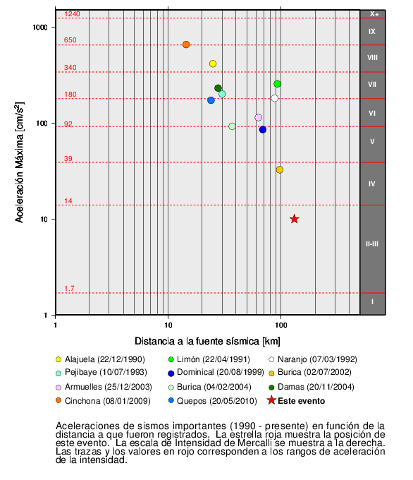 La intensidad es una medida de la fuerza con que un terremoto golpea una zona y se cuantifica en base en los daños que se producen.  Existe una relación entre la Intensidad Modificada de Mercalli (ver cuadro abajo), la aceleración y la velocidad máximas que se obtienen de los registros acelerográficos y es denominada INTENSIDAD INSTRUMENTAL. Esa relación se usa para generar el mapa de arriba en forma automática.  La escala original puede ser consultada en el sitio Web del Servicio Geológico de Estados Unidos en  http://earthquake.usgs.gov/eqcenter/shakemap.