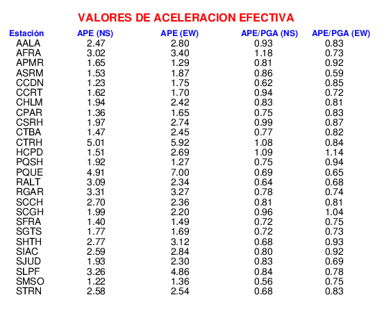 Uno de esos parámetros es la aceleración pico efectiva (APE), que se define como el promedio de las aceleracines espectrales en un rango de periodos de 0,1 a 0,5, dividido por 2,5 ( ATC 3-06).