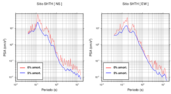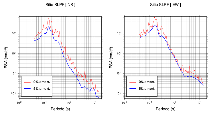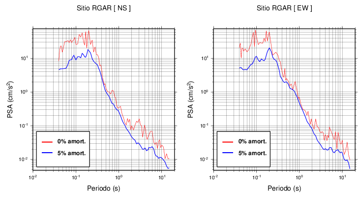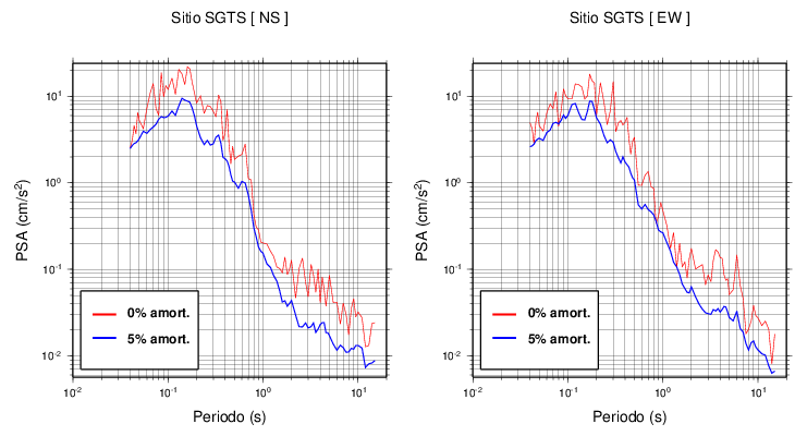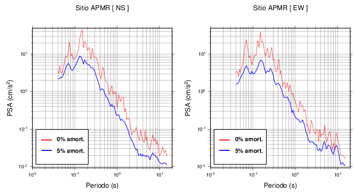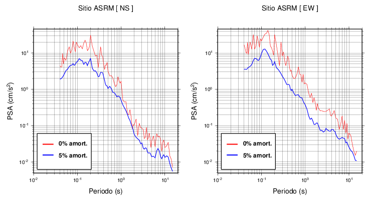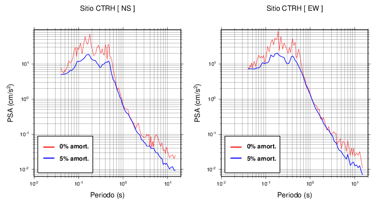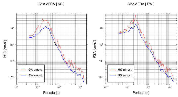 La forma en que un edificio se comporta cuando es sometido a un sismo depende de varios factores entre ellos: - Magnitud del sismo - Duración de la sacudida - Factores dinámicos propios de la estructura - Efecto de amplificación del suelo sobre el cual se asienta la construcción. - Contenido frecuencial de la señal La sacudida del inmueble será mayor si este y el sismo vibran a una misma frecuencia (en un fenómeno que se llama resonancia). Además de esos factores, el edificio mismo ofrece cierta resistencia a la vibración impuesta que se refleja en un porcentaje llamado amortiguamiento. Las construcciones civiles generalmente poseen niveles de mortiguamiento en el rango de 2 a 7% y para edificaciones normales, se asume que es de 5%. De esta manera, la forma de los espectros de diseño esta íntimamente ligada a la zona sísmica y el tipo de suelo donde se ubican las construcciones. Uno de los principales usos de los datos acelerográficos es precisamente para calcular dichos espectros y en este caso se presentan los mismos para cada estación acelerográfica en la componente NS y EW para el 0% y 5% de amortiguamiento. |