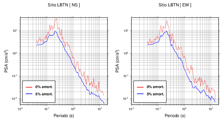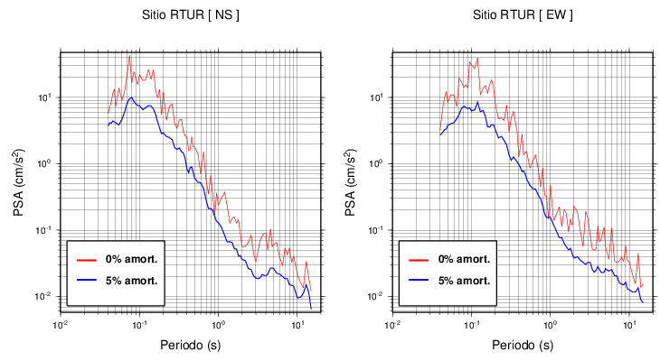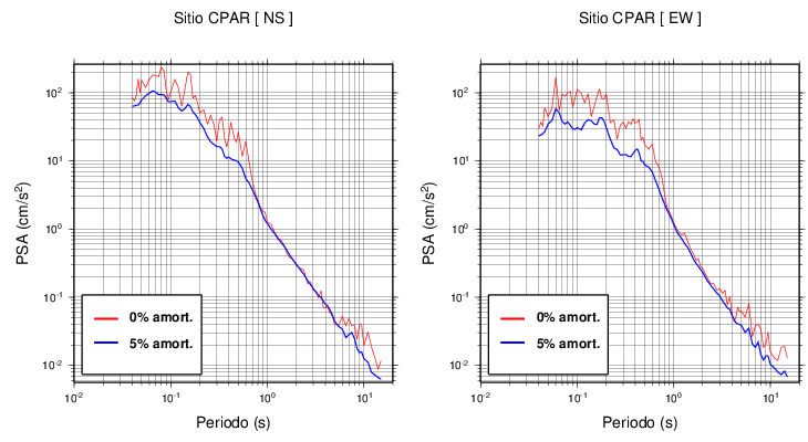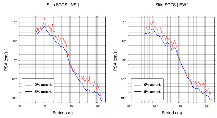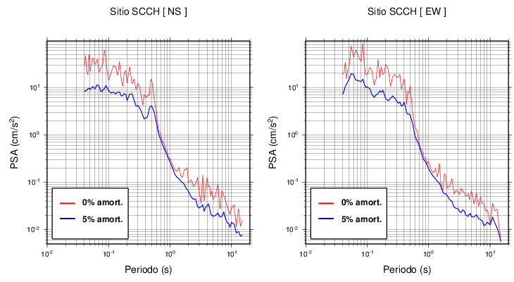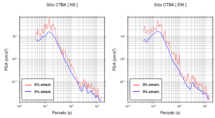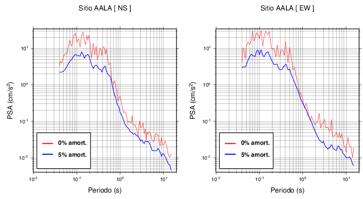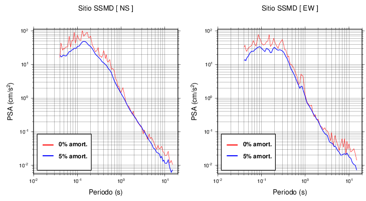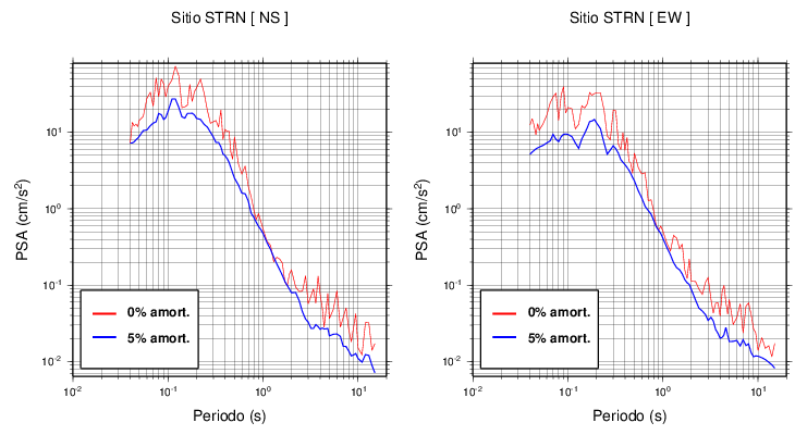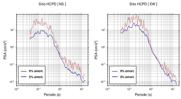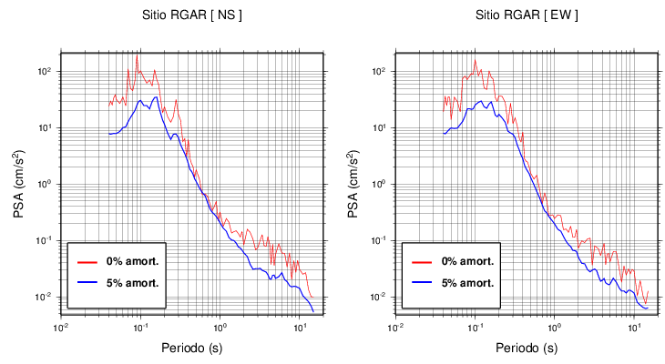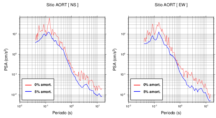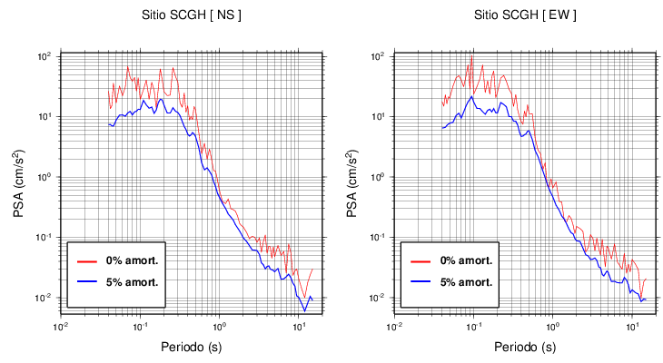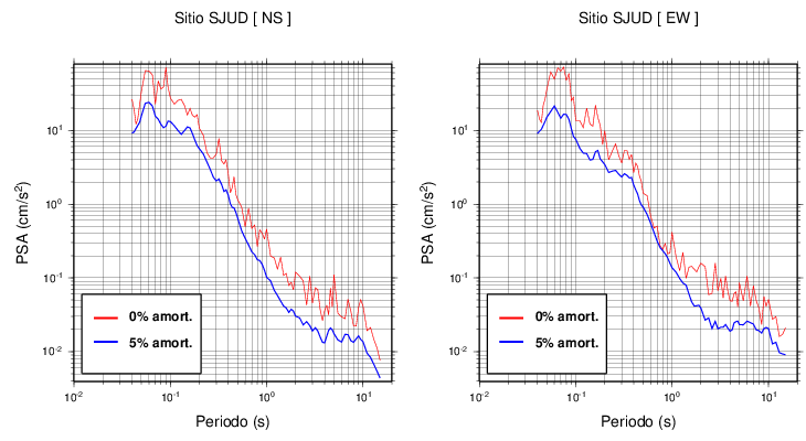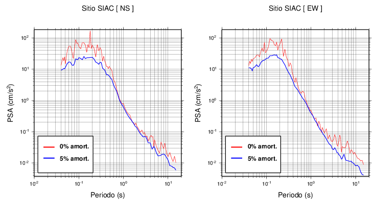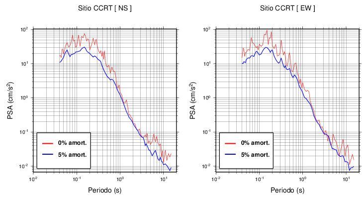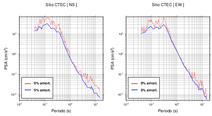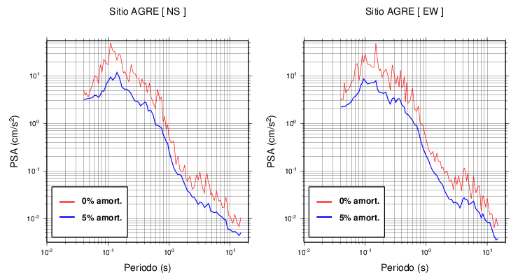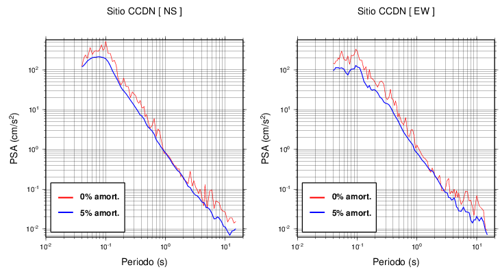 La forma en que un edificio se comporta cuando es sometido a un sismo depende de varios factores entre ellos: - Magnitud del sismo - Duración de la sacudida - Factores dinámicos propios de la estructura - Efecto de amplificación del suelo sobre el cual se asienta la construcción. - Contenido frecuencial de la señal La sacudida del inmueble será mayor si este y el sismo vibran a una misma frecuencia (en un fenómeno que se llama resonancia). Además de esos factores, el edificio mismo ofrece cierta resistencia a la vibración impuesta que se refleja en un porcentaje llamado amortiguamiento. Las construcciones civiles generalmente poseen niveles de mortiguamiento en el rango de 2 a 7% y para edificaciones normales, se asume que es de 5%. De esta manera, la forma de los espectros de diseño esta íntimamente ligada a la zona sísmica y el tipo de suelo donde se ubican las construcciones. Uno de los principales usos de los datos acelerográficos es precisamente para calcular dichos espectros y en este caso se presentan los mismos para cada estación acelerográfica en la componente NS y EW para el 0% y 5% de amortiguamiento. |