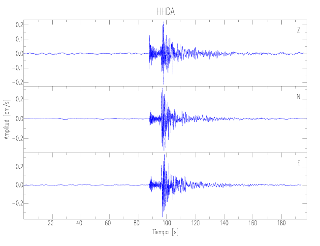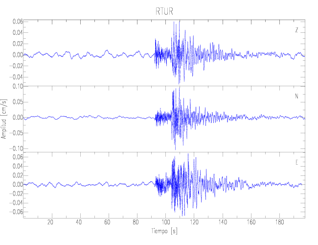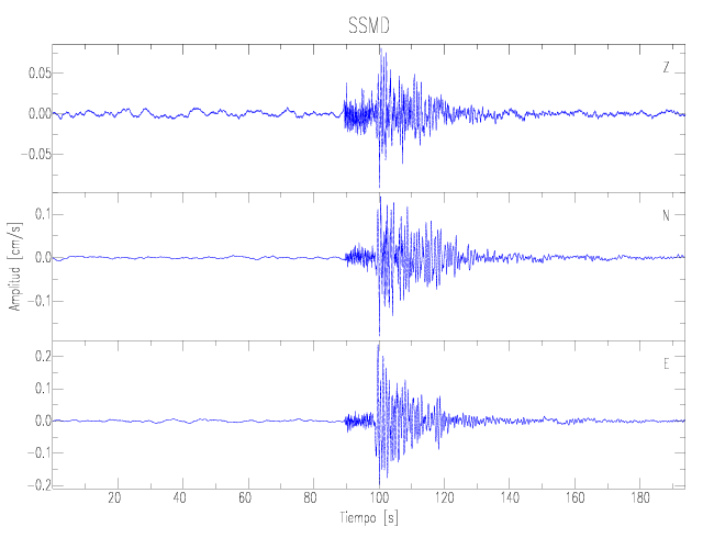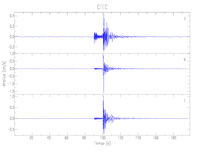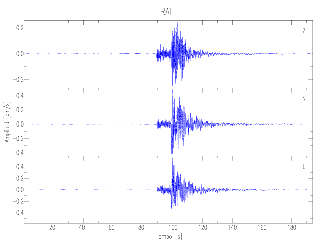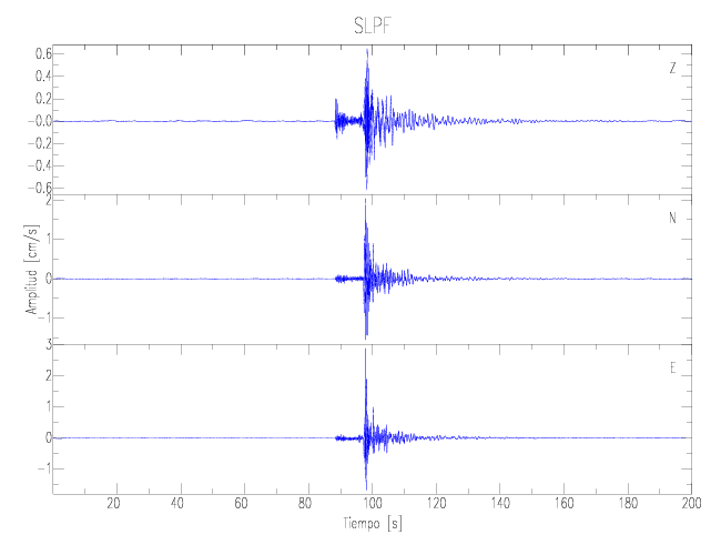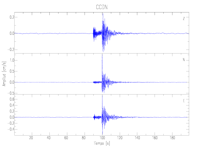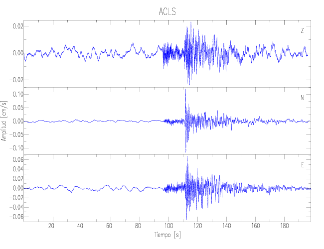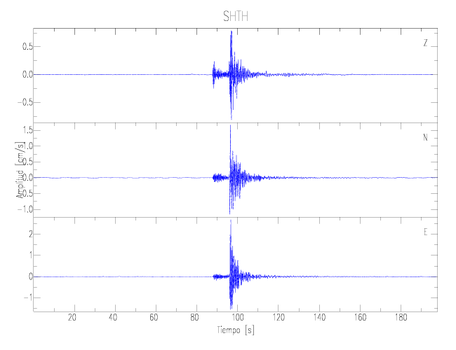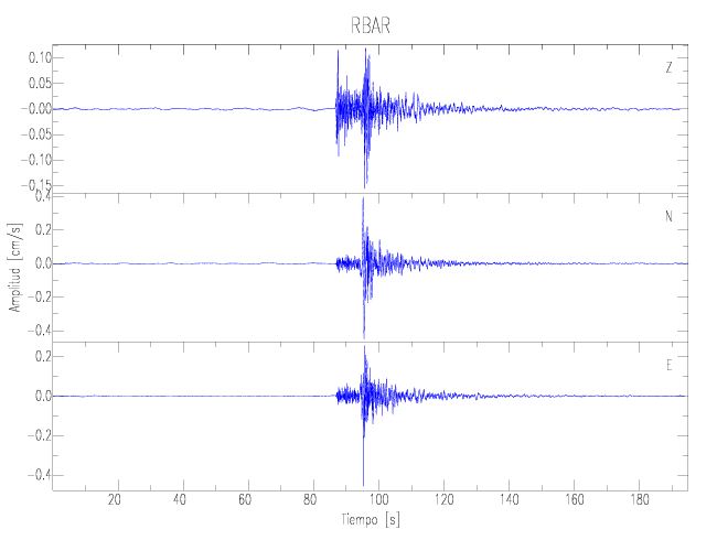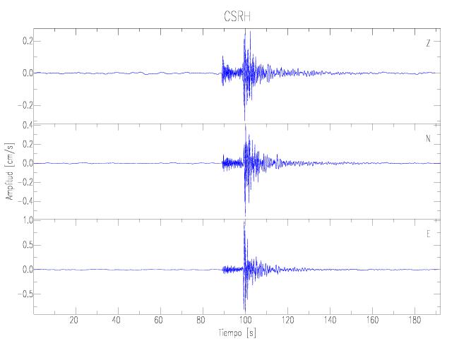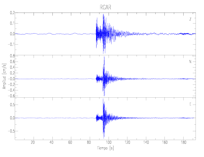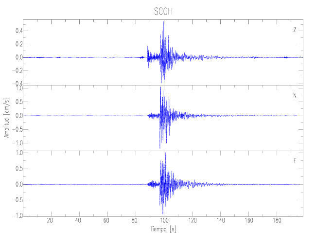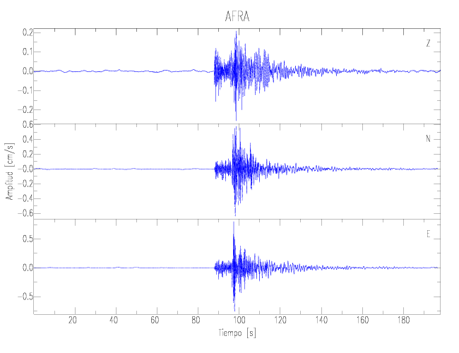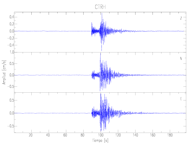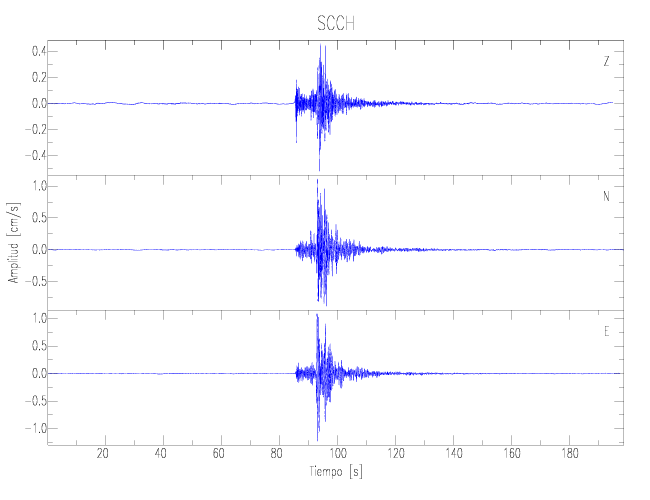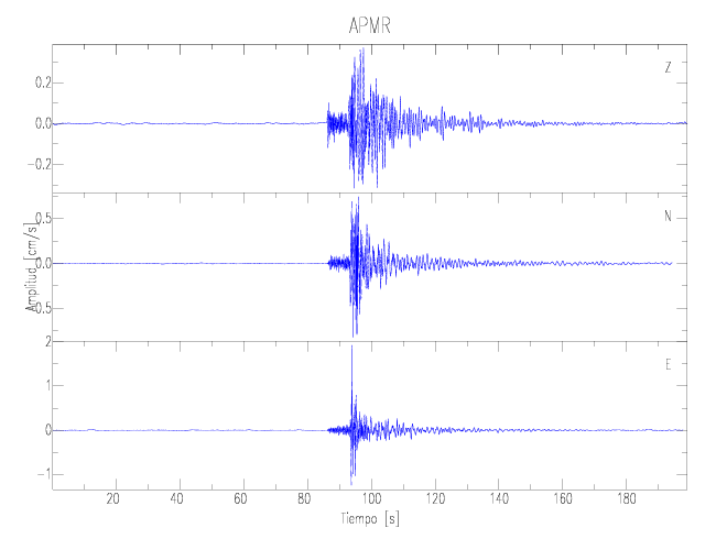 En este mapa se muestran los valores de velocidad máxima alcanzada por cada uno de los sitios que registró el terremoto.  En rojo se ven los valores más altos y en blanco los más bajos.  Valores intermedios se pueden ver en la escala al pie del mapa.