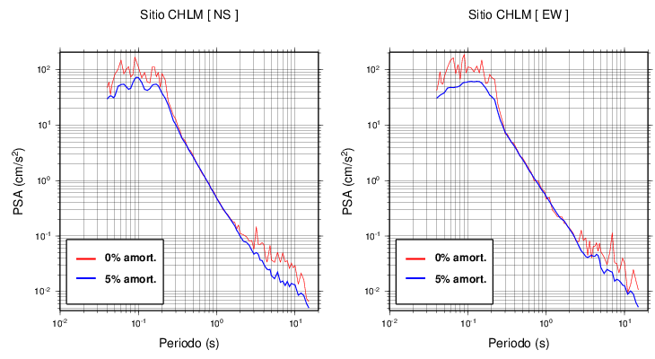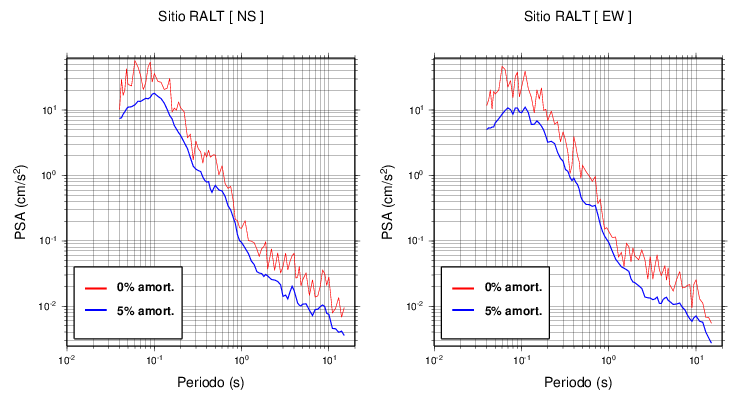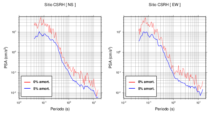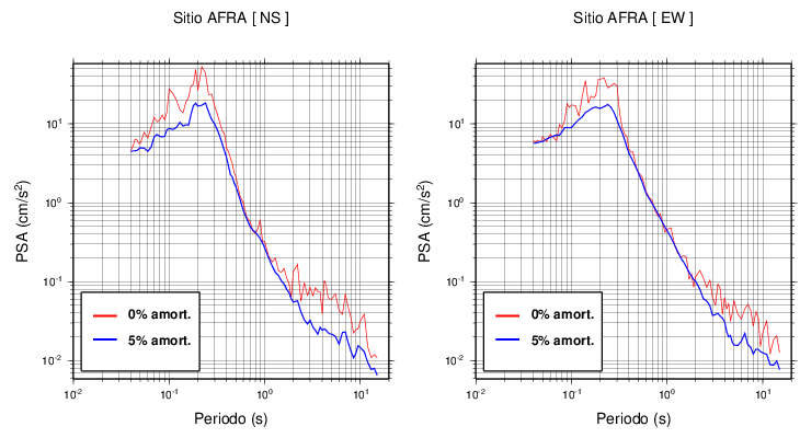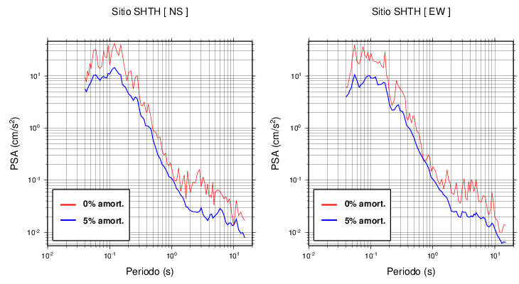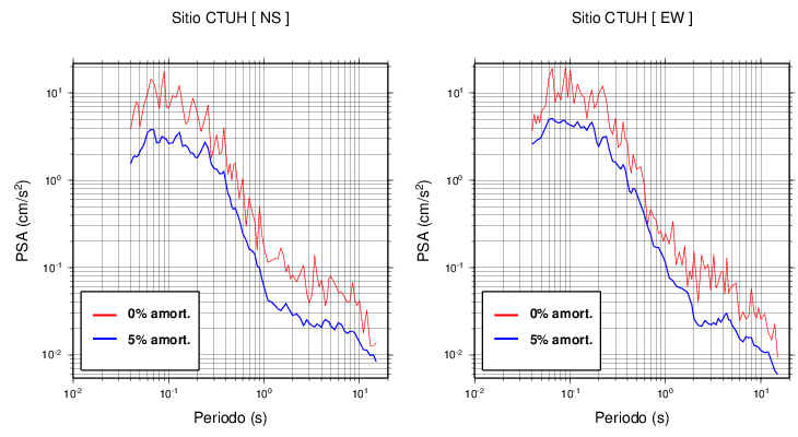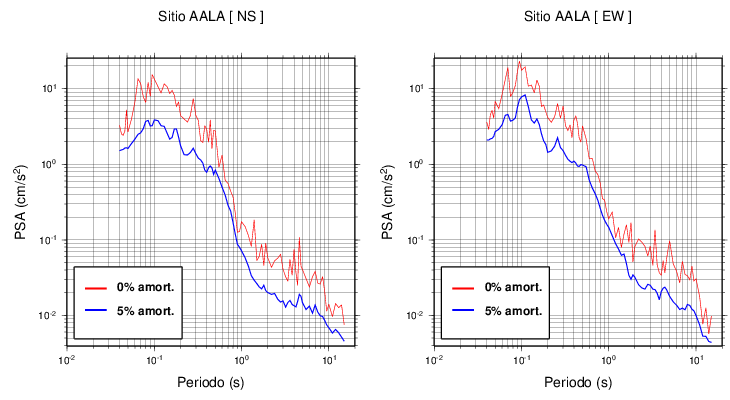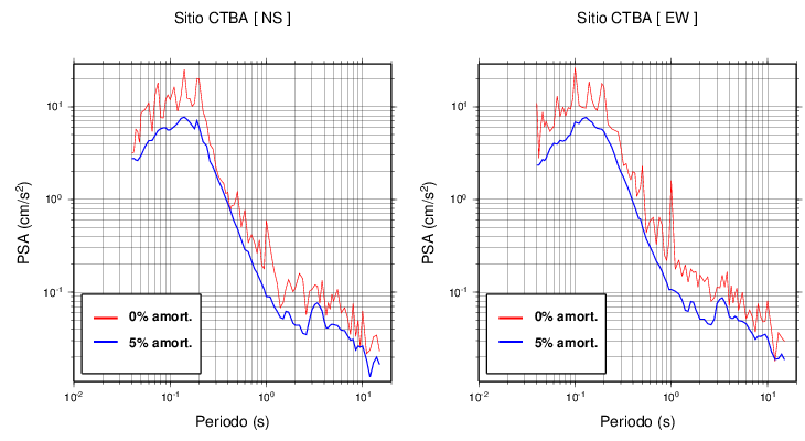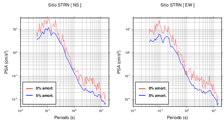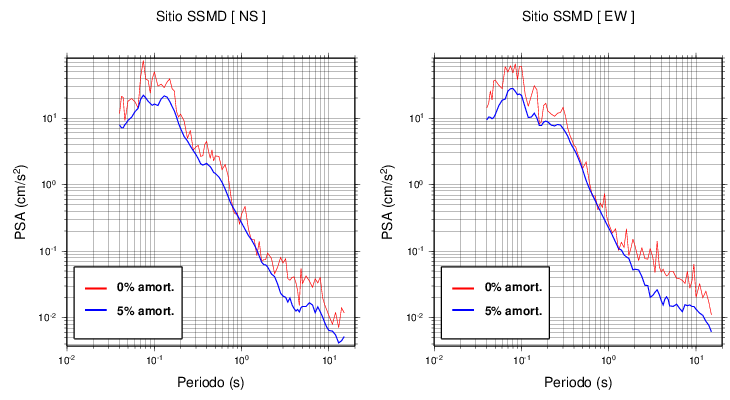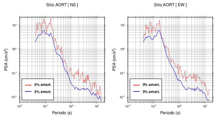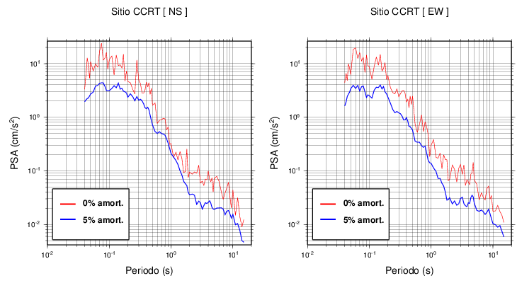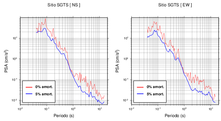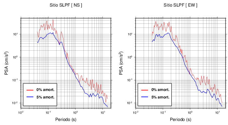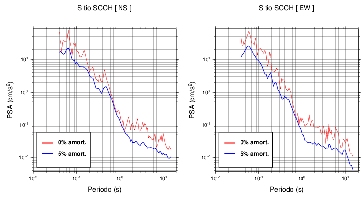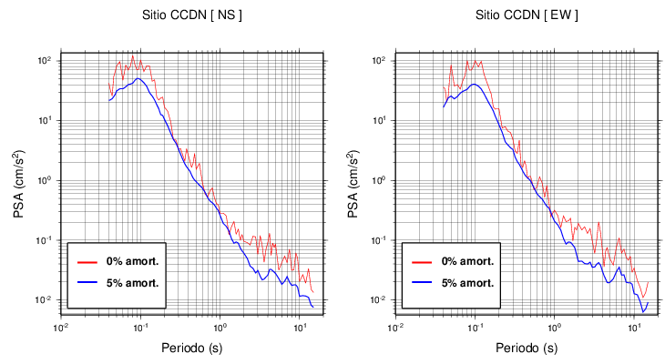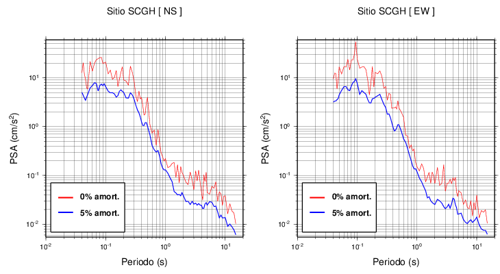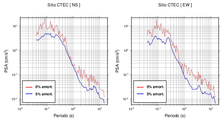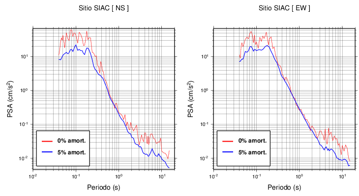 Uno de los principales usos de los datos acelerográficos es precisamente para calcular dichos espectros y en este caso se presentan los mismos para cada estación acelerográfica en la componente NS y EW para el 0% y 5% de amortiguamiento.