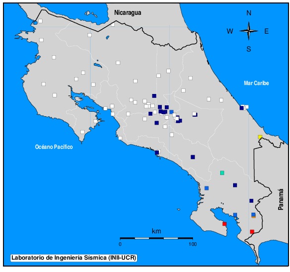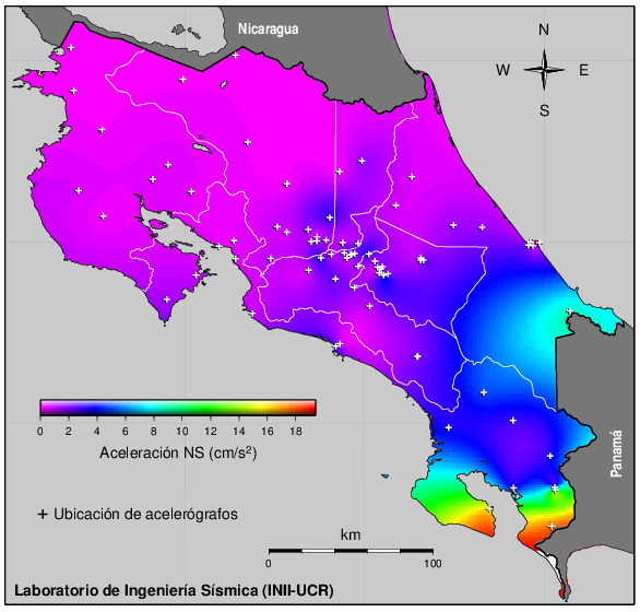 El siguiente mapa muestra los valores de aceleración máximos absolutos.  Es decir, la estación que reportó el mayor valor de aceleración aparecerá en color rojo de acuerdo a la escala proporcionada al pie de la figura.