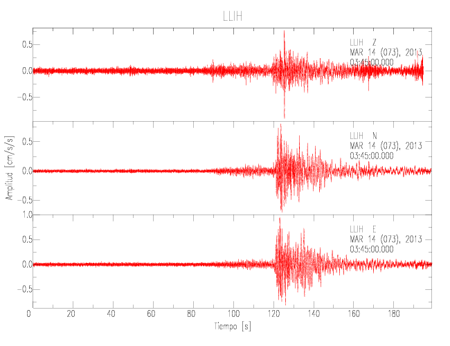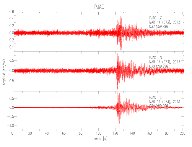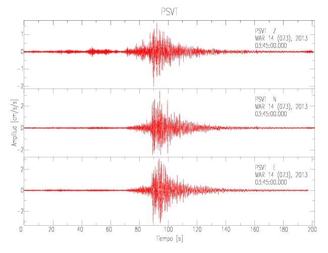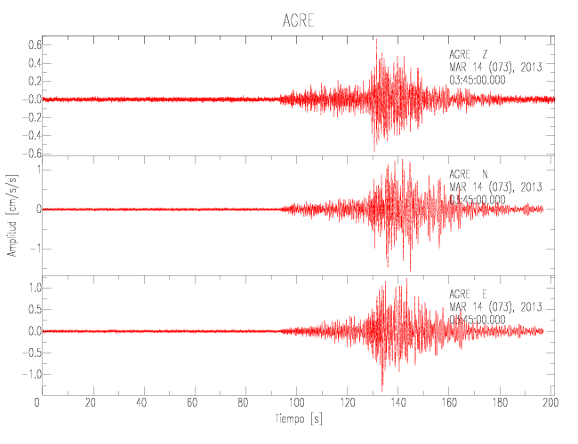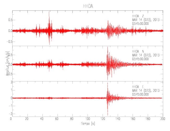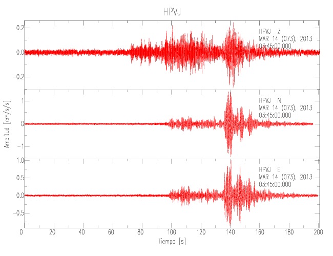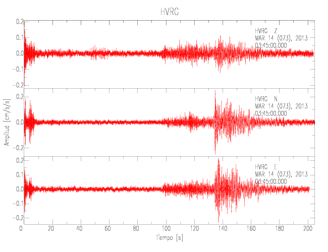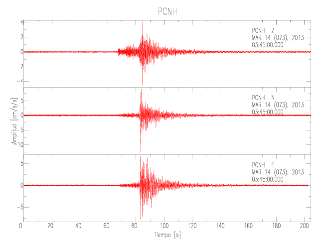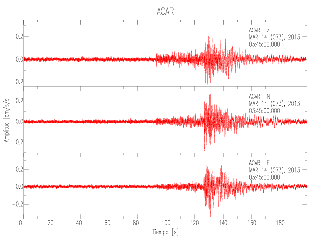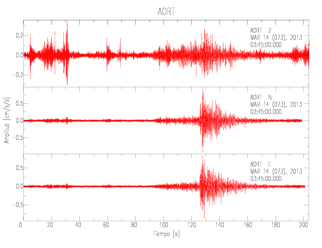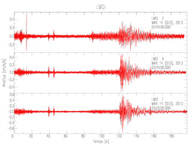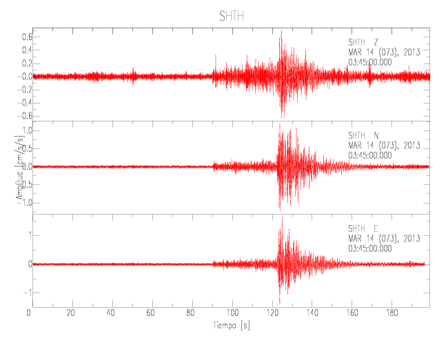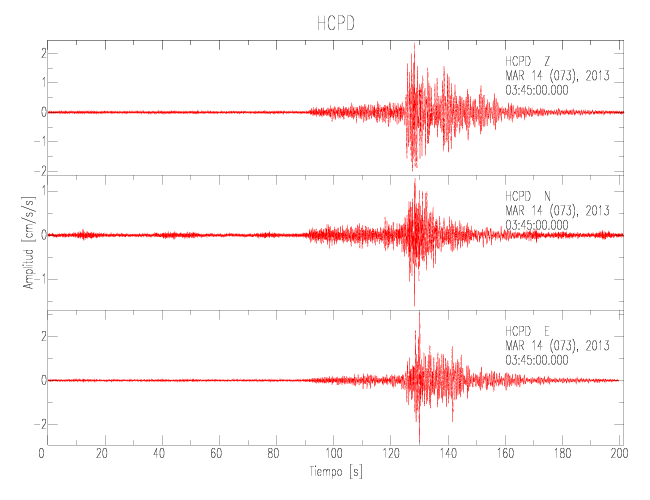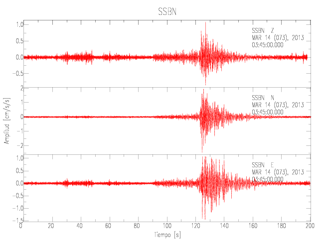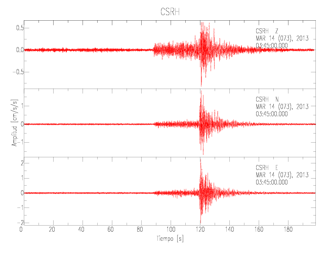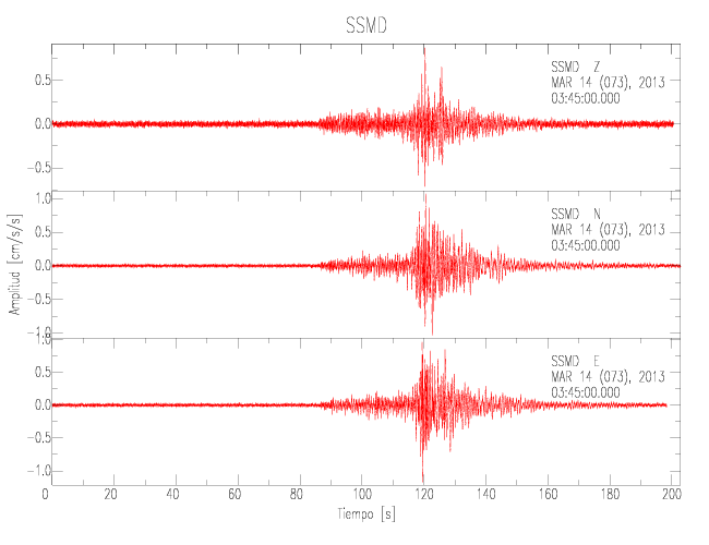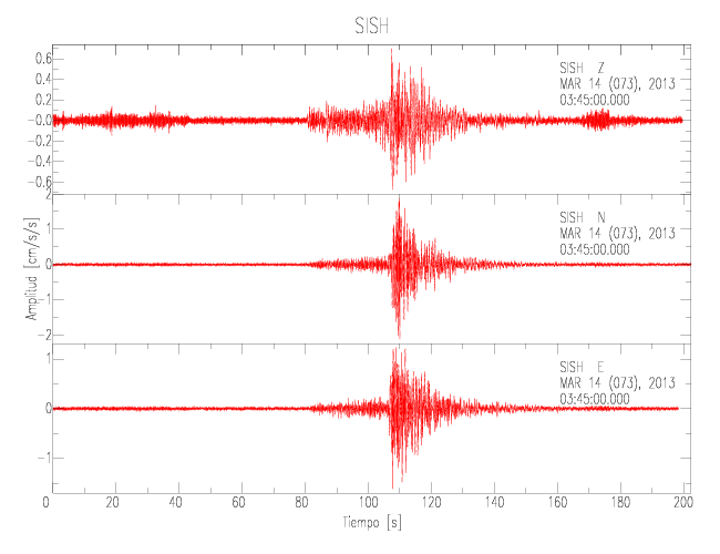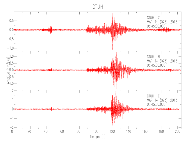 Los botones de abajo muestran las 3 componentes de aceleración (Vertical, Norte-Sur y Este-Oeste) corregidas por línea base y filtradas en el rango de 0.1 a 10 Hz.