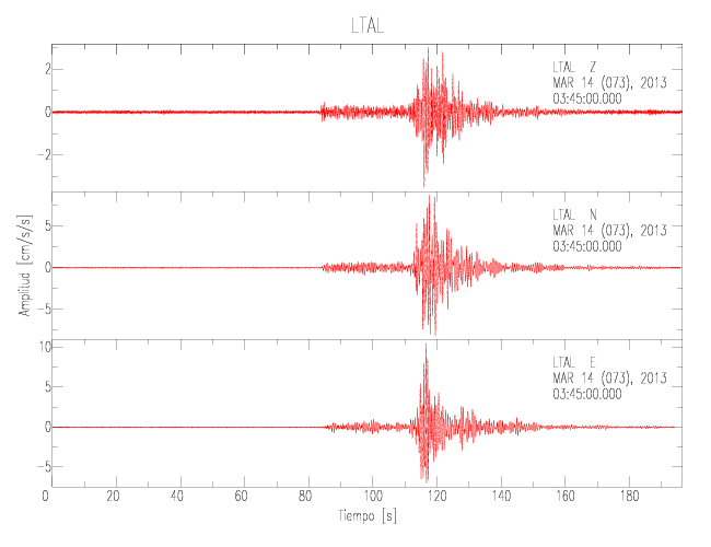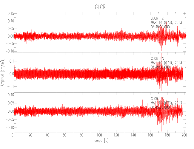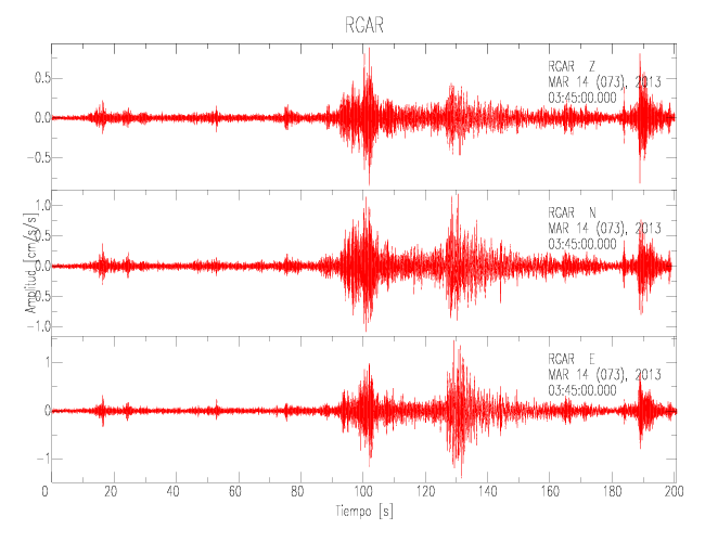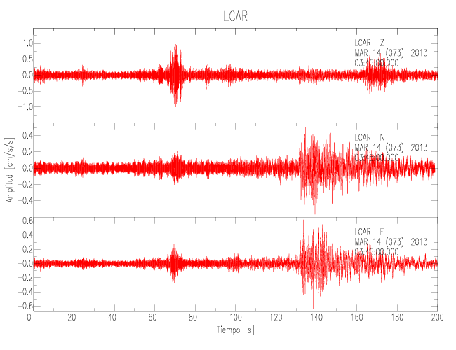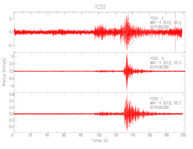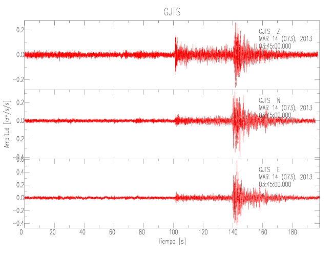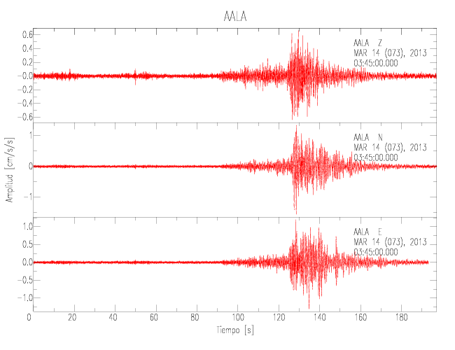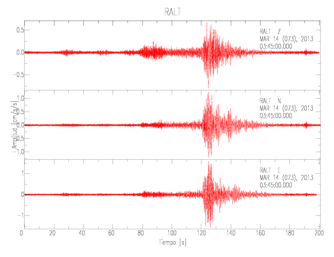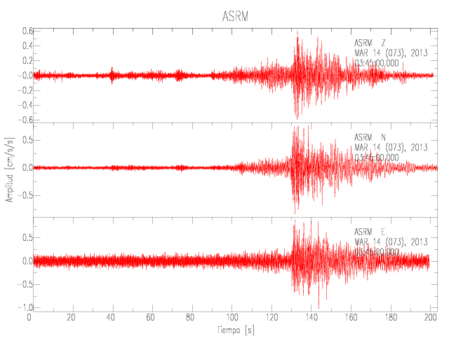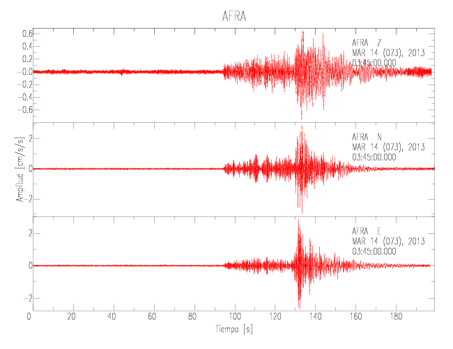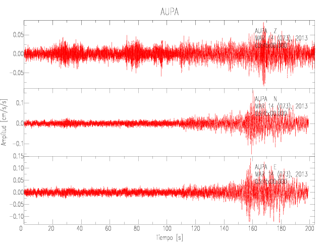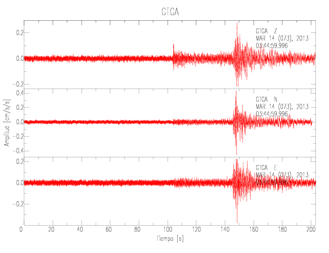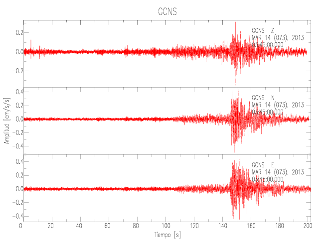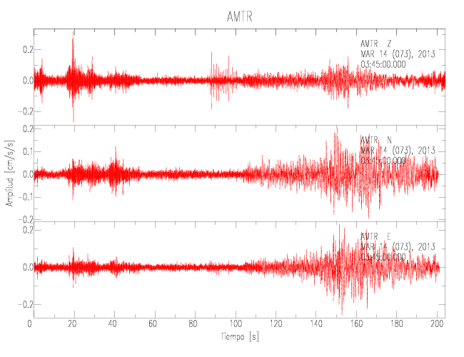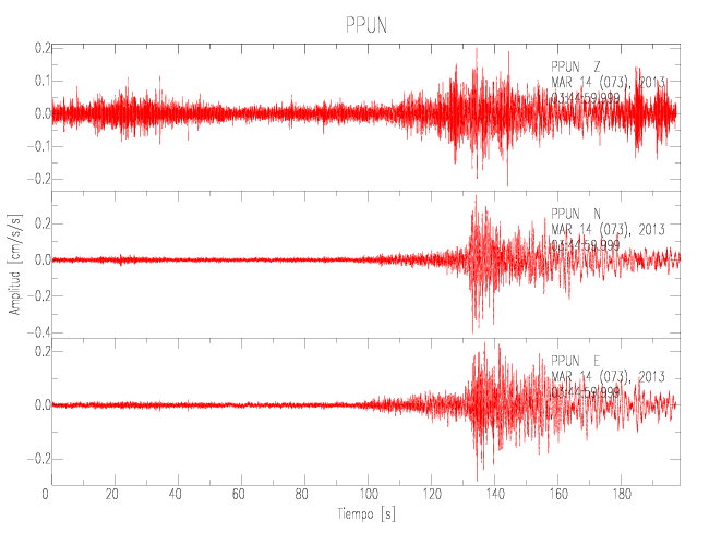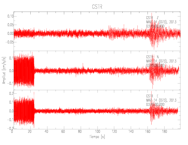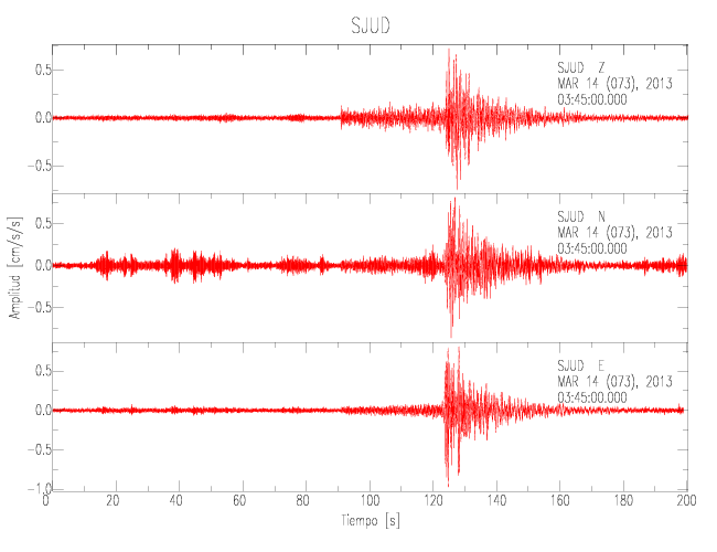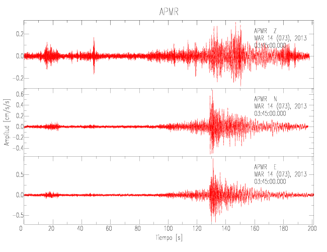 Los botones de abajo muestran las 3 componentes de aceleración (Vertical, Norte-Sur y Este-Oeste) corregidas por línea base y filtradas en el rango de 0.1 a 10 Hz.