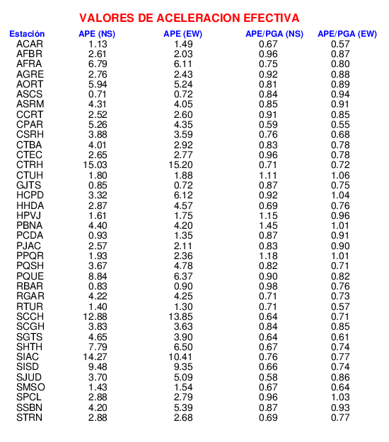 Uno de esos parámetros es la aceleración pico efectiva (APE), que se define como el promedio de las aceleracines espectrales en un rango de periodos de 0,1 a 0,5, dividido por 2,5 ( ATC 3-06).