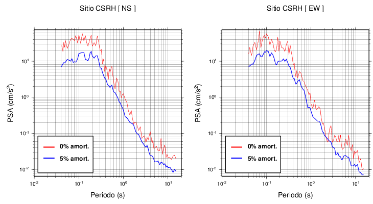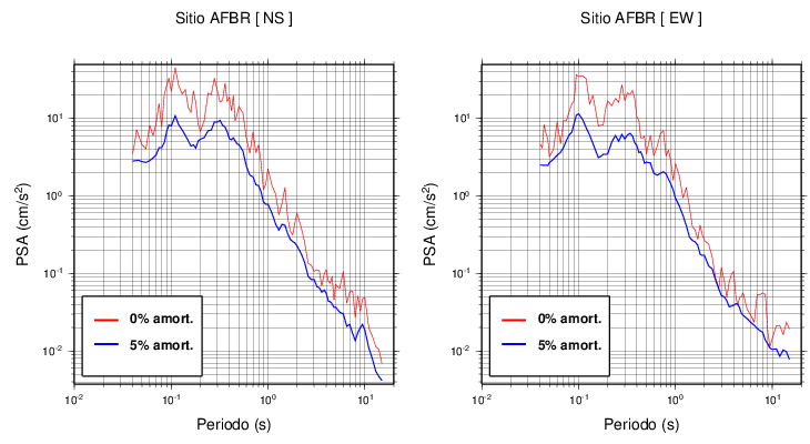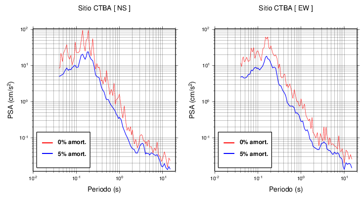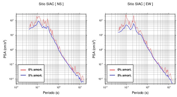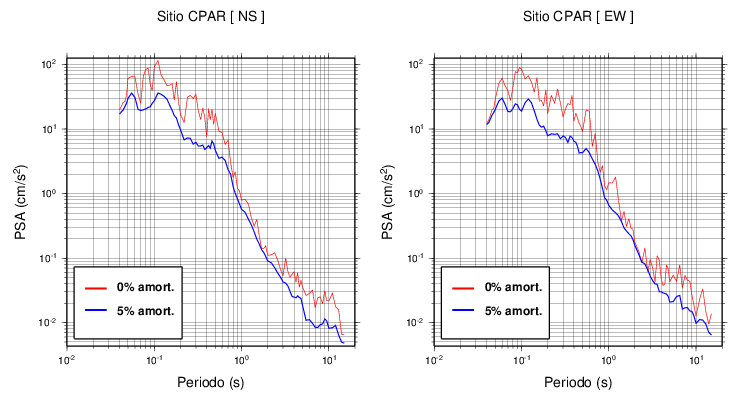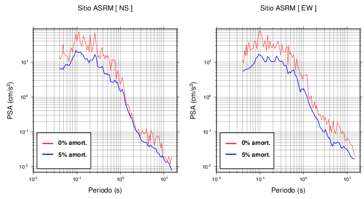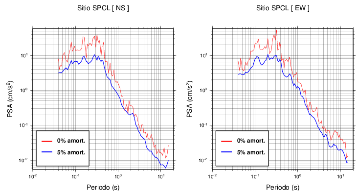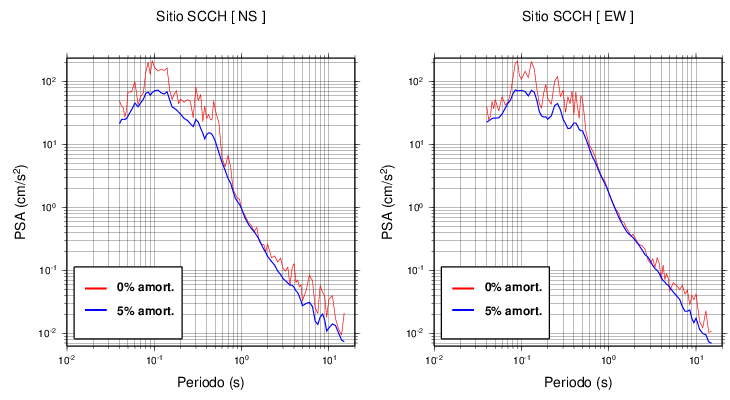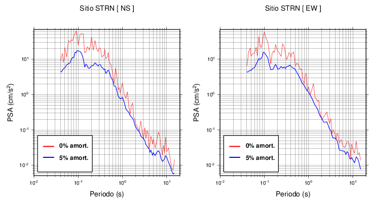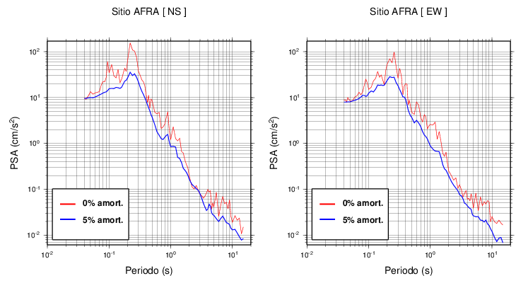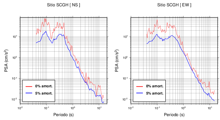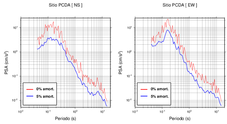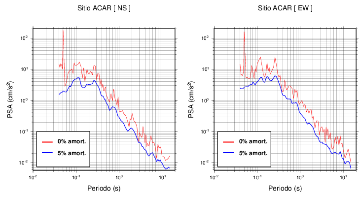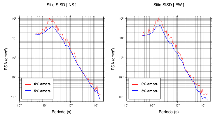 La forma en que un edificio se comporta cuando es sometido a un sismo depende de varios factores entre ellos: - Magnitud del sismo - Duración de la sacudida - Factores dinámicos propios de la estructura - Efecto de amplificación del suelo sobre el cual se asienta la construcción. - Contenido frecuencial de la señal La sacudida del inmueble será mayor si este y el sismo vibran a una misma frecuencia (en un fenómeno que se llama resonancia). Además de esos factores, el edificio mismo ofrece cierta resistencia a la vibración impuesta que se refleja en un porcentaje llamado amortiguamiento. Las construcciones civiles generalmente poseen niveles de mortiguamiento en el rango de 2 a 7% y para edificaciones normales, se asume que es de 5%. De esta manera, la forma de los espectros de diseño esta íntimamente ligada a la zona sísmica y el tipo de suelo donde se ubican las construcciones. Uno de los principales usos de los datos acelerográficos es precisamente para calcular dichos espectros y en este caso se presentan los mismos para cada estación acelerográfica en la componente NS y EW para el 0% y 5% de amortiguamiento. |