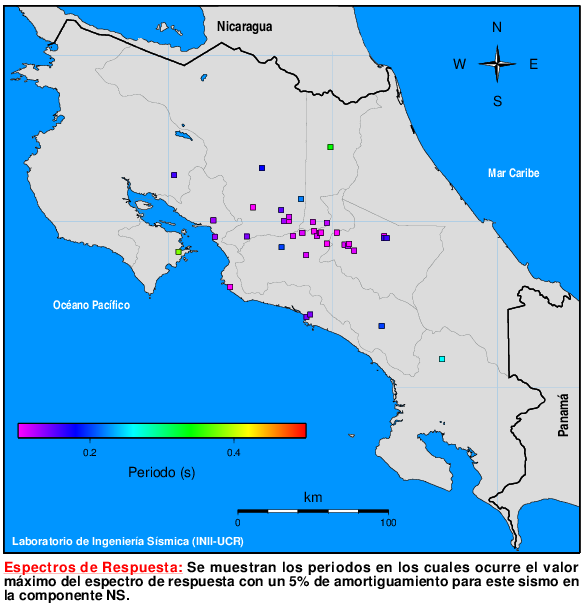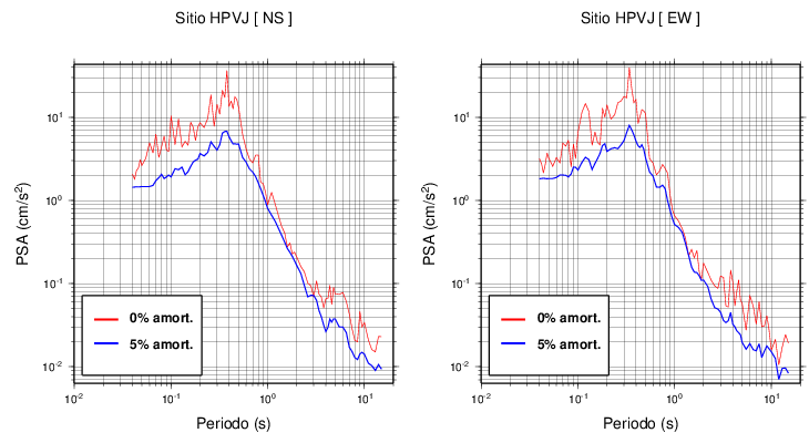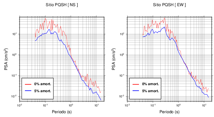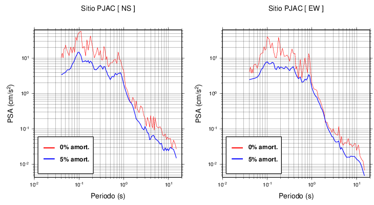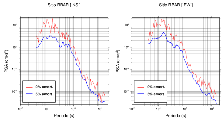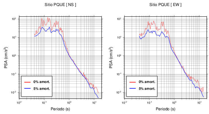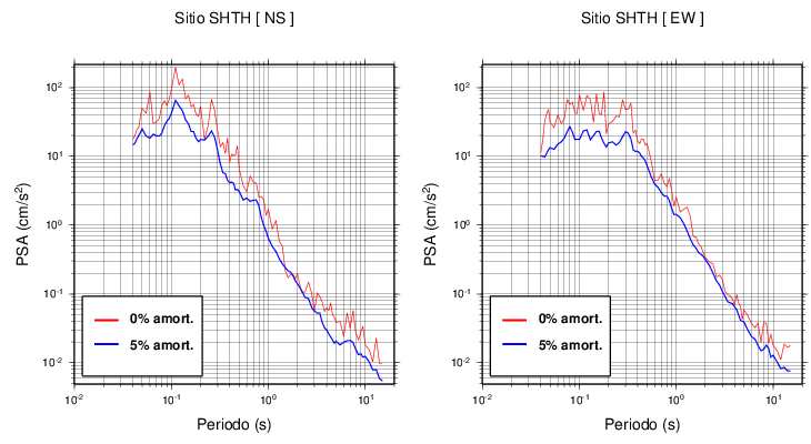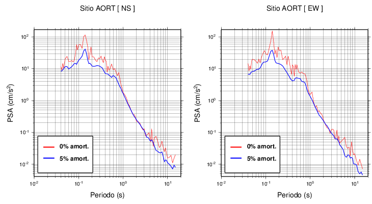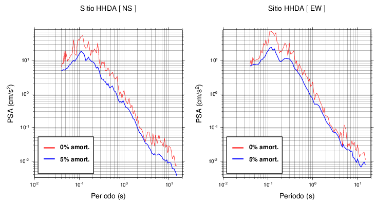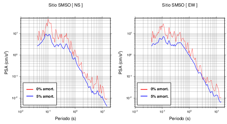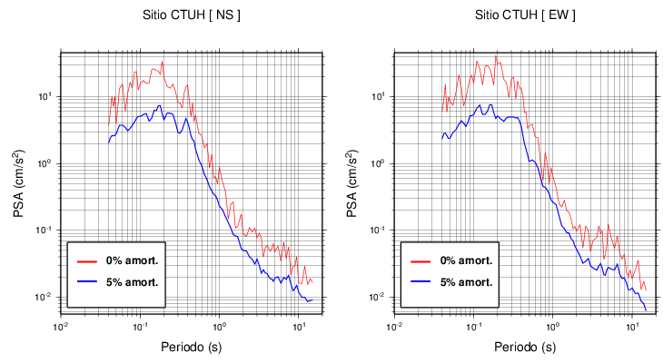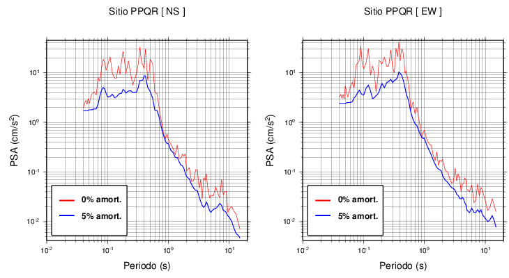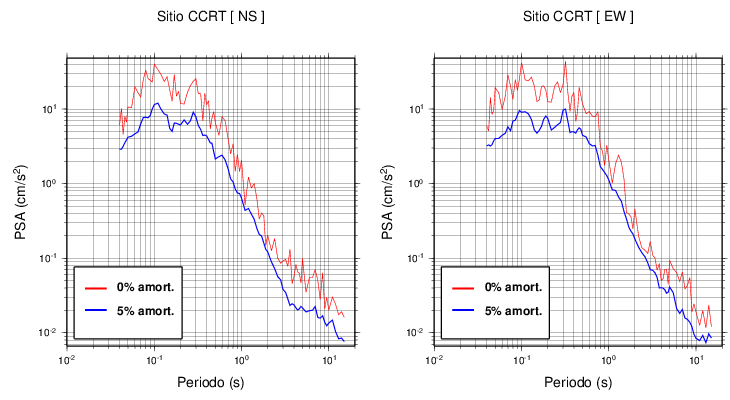 La forma en que un edificio se comporta cuando es sometido a un sismo depende de varios factores entre ellos: - Magnitud del sismo - Duración de la sacudida - Factores dinámicos propios de la estructura - Efecto de amplificación del suelo sobre el cual se asienta la construcción. - Contenido frecuencial de la señal La sacudida del inmueble será mayor si este y el sismo vibran a una misma frecuencia (en un fenómeno que se llama resonancia). Además de esos factores, el edificio mismo ofrece cierta resistencia a la vibración impuesta que se refleja en un porcentaje llamado amortiguamiento. Las construcciones civiles generalmente poseen niveles de mortiguamiento en el rango de 2 a 7% y para edificaciones normales, se asume que es de 5%. De esta manera, la forma de los espectros de diseño esta íntimamente ligada a la zona sísmica y el tipo de suelo donde se ubican las construcciones. Uno de los principales usos de los datos acelerográficos es precisamente para calcular dichos espectros y en este caso se presentan los mismos para cada estación acelerográfica en la componente NS y EW para el 0% y 5% de amortiguamiento. |