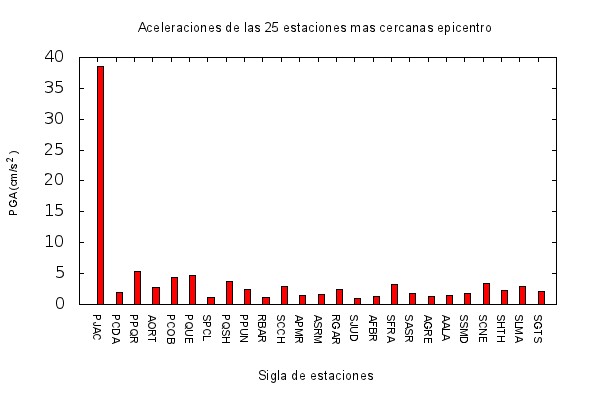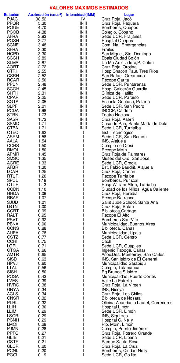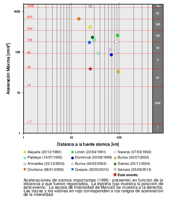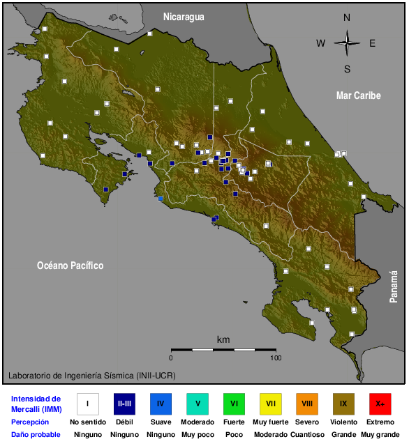 La intensidad es una medida de la fuerza con que un terremoto golpea una zona y se cuantifica en base en los daños que se producen.  Existe una relación entre la Intensidad Modificada de Mercalli (ver cuadro abajo), la aceleración y la velocidad máximas que se obtienen de los registros acelerográficos y es denominada INTENSIDAD INSTRUMENTAL. Esa relación se usa para generar el mapa de arriba en forma automática.  La escala original puede ser consultada en el sitio Web del Servicio Geológico de Estados Unidos en  http://earthquake.usgs.gov/eqcenter/shakemap.