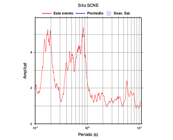 mayores a 0.4 s). En este informe se grafica tanto el efecto de sitio del sismo registrado como el valor promedio en cada estación. El ajuste no debe ser exacto ya que el valor promedio es más representativo de la respuesta del suelo que un solo evento. Sin embargo, se deben notar características generales como máximos y mínimos de amplificación aproximadamente en los mismos valores de período. |