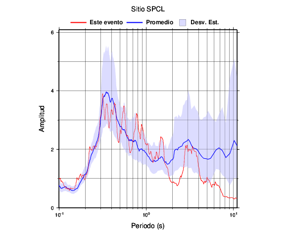 mayores a 0.4 s). En este informe se grafica tanto el efecto de sitio del sismo registrado como el valor promedio en cada estación. El ajuste no debe ser exacto ya que el valor promedio es más representativo de la respuesta del suelo que un solo evento. Sin embargo, se deben notar características generales como máximos y mínimos de amplificación aproximadamente en los mismos valores de período. |