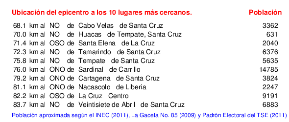 Mapa de la zona epicentral. Se muestran las poblaciones más cercanas al epicentro y fallas activas. Abajo están las distancias que hay del epicentro a cada uno de los diez sitios más cercanos y la cantidad de habitantes que poseen.