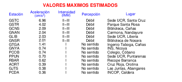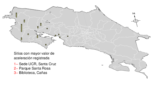 Intensidades en sitios de registro.Cada uno de los cuadrados en el mapa corresponde a la ubicación de un acelerógrafo al momento del sismo. Estos se muestran en distintos colores según la escala mostrada al pie de la figura.