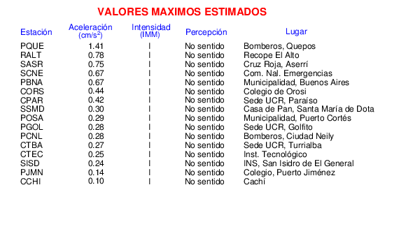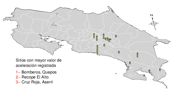 Intensidades en sitios de registro.Cada uno de los cuadrados en el mapa corresponde a la ubicación de un acelerógrafo al momento del sismo. Estos se muestran en distintos colores según la escala mostrada al pie de la figura.