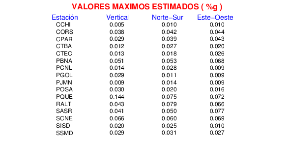 La siguiente tabla muestra los datos de aceleración máxima para cada componente en porcentaje de la aceleración de la gravedad (%g). Estos se obtienen dividiendo el valor del PGA registrado por 980 cm/s2 y multiplicándolo por 100.