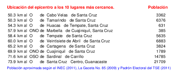 Mapa de la zona epicentral. Se muestran las poblaciones más cercanas al epicentro y fallas activas. Abajo están las distancias que hay del epicentro a cada uno de los diez sitios más cercanos y la cantidad de habitantes que poseen.