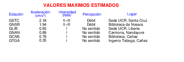 Intensidades en sitios de registro.Cada uno de los cuadrados en el mapa corresponde a la ubicación de un acelerógrafo al momento del sismo. Estos se muestran en distintos colores según la escala mostrada al pie de la figura.
