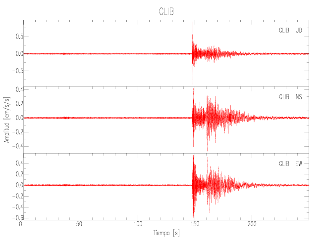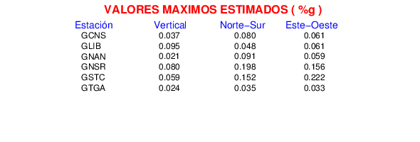 La siguiente tabla muestra los datos de aceleración máxima para cada componente en porcentaje de la aceleración de la gravedad (%g). Estos se obtienen dividiendo el valor del PGA registrado por 980 cm/s2 y multiplicándolo por 100.