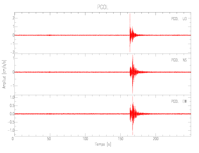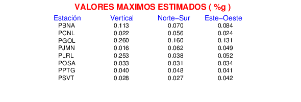 La siguiente tabla muestra los datos de aceleración máxima para cada componente en porcentaje de la aceleración de la gravedad (%g). Estos se obtienen dividiendo el valor del PGA registrado por 980 cm/s2 y multiplicándolo por 100.