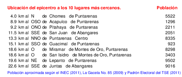 Mapa de la zona epicentral. Se muestran las poblaciones más cercanas al epicentro y fallas activas. Abajo están las distancias que hay del epicentro a cada uno de los diez sitios más cercanos y la cantidad de habitantes que poseen.