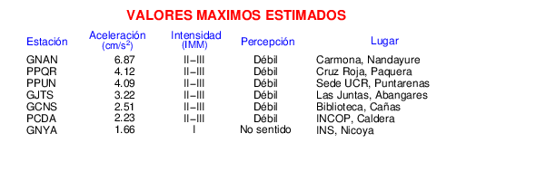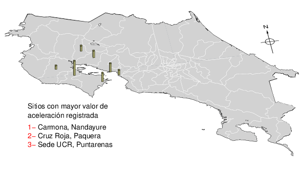 Intensidades en sitios de registro.Cada uno de los cuadrados en el mapa corresponde a la ubicación de un acelerógrafo al momento del sismo. Estos se muestran en distintos colores según la escala mostrada al pie de la figura.