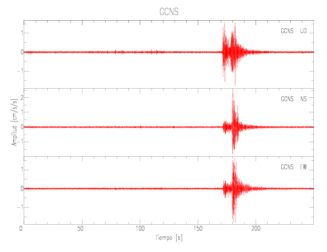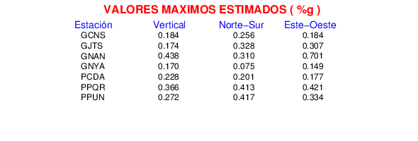 La siguiente tabla muestra los datos de aceleración máxima para cada componente en porcentaje de la aceleración de la gravedad (%g). Estos se obtienen dividiendo el valor del PGA registrado por 980 cm/s2 y multiplicándolo por 100.