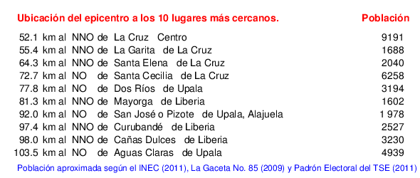 Mapa de la zona epicentral. Se muestran las poblaciones más cercanas al epicentro y fallas activas. Abajo están las distancias que hay del epicentro a cada uno de los diez sitios más cercanos y la cantidad de habitantes que poseen.