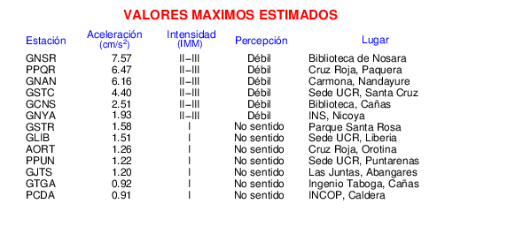 Intensidades en sitios de registro.Cada uno de los cuadrados en el mapa corresponde a la ubicación de un acelerógrafo al momento del sismo. Estos se muestran en distintos colores según la escala mostrada al pie de la figura.