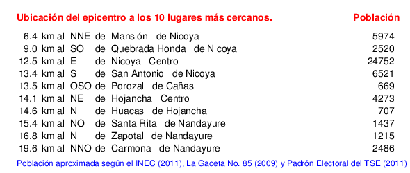 Mapa de la zona epicentral. Se muestran las poblaciones más cercanas al epicentro y fallas activas. Abajo están las distancias que hay del epicentro a cada uno de los diez sitios más cercanos y la cantidad de habitantes que poseen.