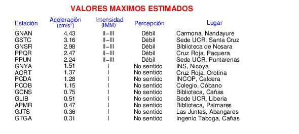 Intensidades en sitios de registro.Cada uno de los cuadrados en el mapa corresponde a la ubicación de un acelerógrafo al momento del sismo. Estos se muestran en distintos colores según la escala mostrada al pie de la figura.