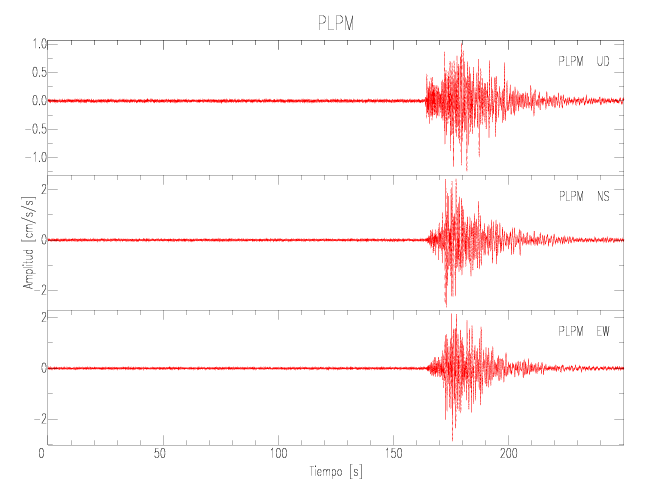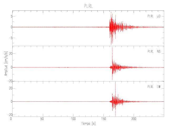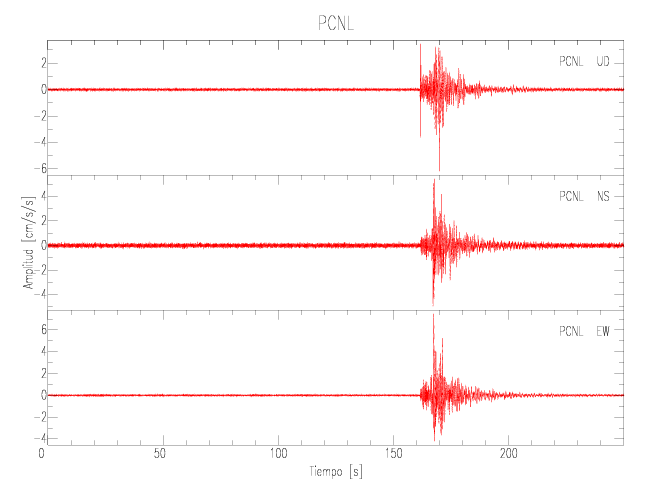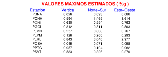 La siguiente tabla muestra los datos de aceleración máxima para cada componente en porcentaje de la aceleración de la gravedad (%g). Estos se obtienen dividiendo el valor del PGA registrado por 980 cm/s2 y multiplicándolo por 100.