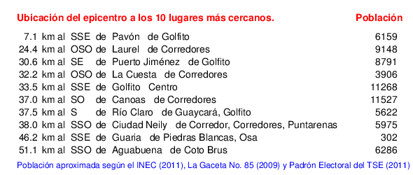 Mapa de la zona epicentral. Se muestran las poblaciones más cercanas al epicentro y fallas activas. Abajo están las distancias que hay del epicentro a cada uno de los diez sitios más cercanos y la cantidad de habitantes que poseen.