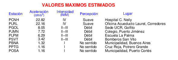 Intensidades en sitios de registro.Cada uno de los cuadrados en el mapa corresponde a la ubicación de un acelerógrafo al momento del sismo. Estos se muestran en distintos colores según la escala mostrada al pie de la figura.