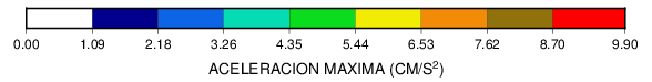 Mapa de valores de aceleración máximos. El mayor valor de aceleración aparecerá en color rojo de acuerdo a la escala proporcionada al pie de la figura.