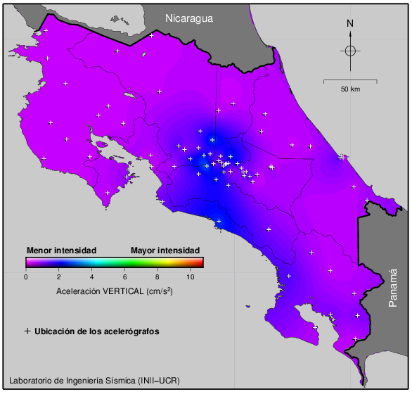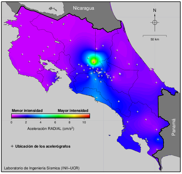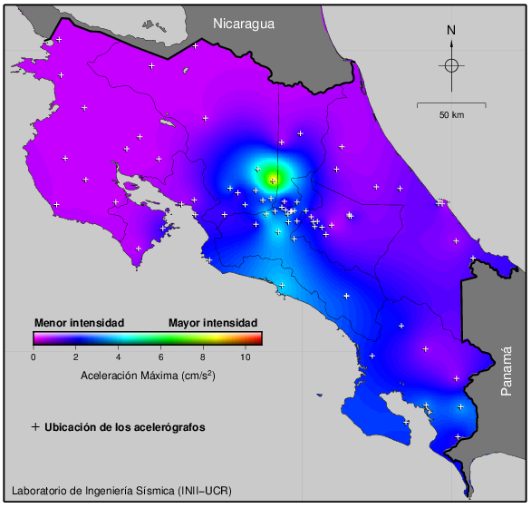 Estos son los valores de PGA de algunos sismos de importancia que han sucedido en Costa Rica desde 1990 hasta el presente. El sismo último es mostrado como una estrella roja. El más grande registrado ha sido el del 05 de setiembre del 2012 en Nicoya con una magnitud Mw 7.6. El del 22 de abril de 1991 en el Valle de la Estrella también fue igualmente grande, sin embargo, en ese entonces la cobertura de la red se limitaba al Valle Central, por lo que no se obtuvieron registros cerca del epicentro.