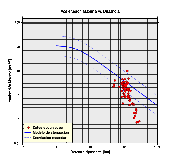 Datos del valor de la aceleración máxima (PGA por sus siglas en inglés) de cada estación (puntos rojos) en función de la distancia al hipocentro. Las trazas azules corresponden al modelo de atenuación y su respectiva desviación estándar.