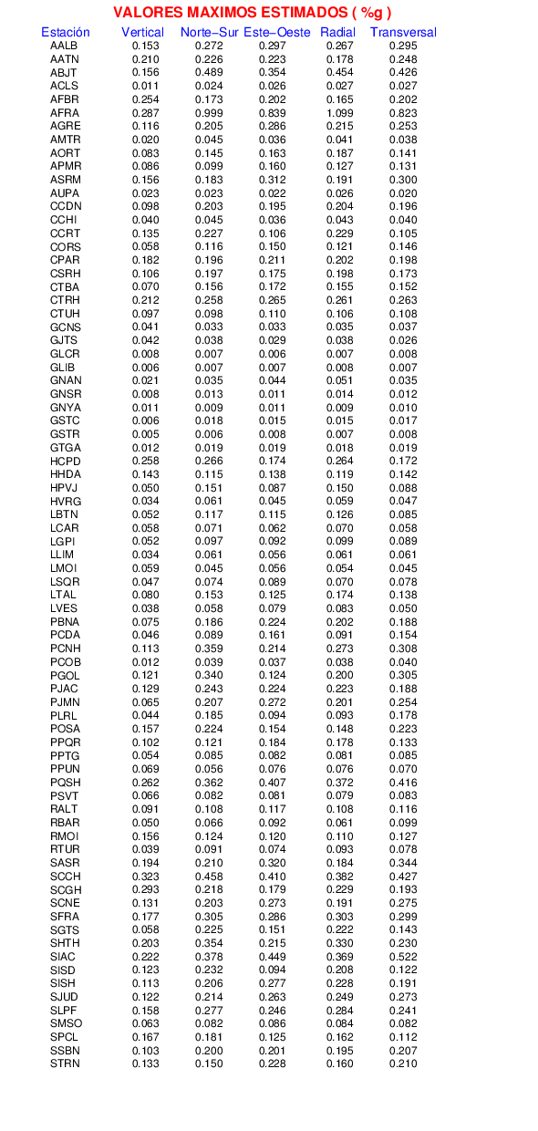 La siguiente tabla muestra los datos de aceleración máxima para cada componente en porcentaje de la aceleración de la gravedad (%g). Estos se obtienen dividiendo el valor del PGA registrado por 980 cm/s2 y multiplicándolo por 100. Las estaciones se listan en orden alfabético. Los valores de las últimas dos columnas corresponden a la componente radial y transversal.