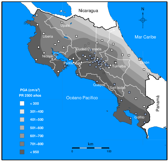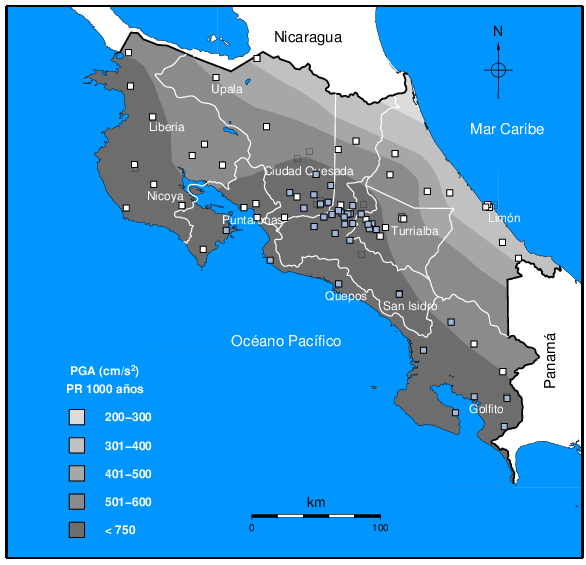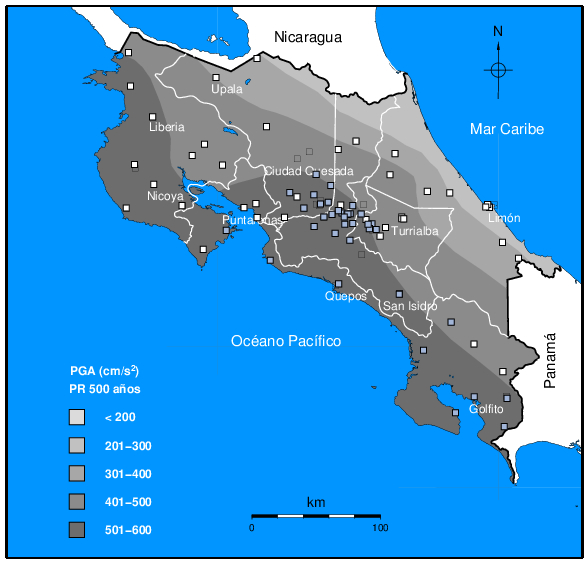 En Costa Rica, se ha calculado la amenaza sísmica para tres diferentes ventanas de tiempo o periodos de retorno: 500, 1000 y 2500 años. El valor de la amenaza disminiye según nos alejemos del Pacífico y nos movamos hacia el Caribe. La razón para esto es que a lo largo de la costa Pacífica del país es donde se esperaría que sudecieran los terremotos más fuertes.