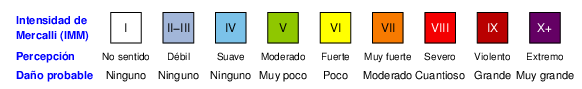 Las estaciones también muestran el color de acuerdo a la escala de la intensidad de abajo. Zonas urbanas y carreteras principales se muestran en trazas grises. Las trazas rojas corresponden a fallas del Cuaternario (recientes o activas). Las trazas de color blanco son los límites de provincia.