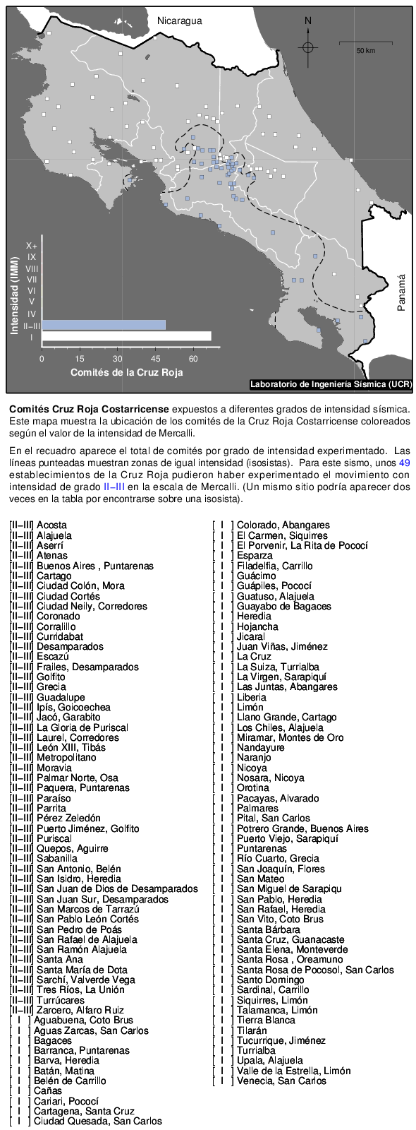 Cada punto sobre el mapa es la cabecera de un distrito. El número de habitantes que hay en cada uno se suma si se encuentra dentro de una misma zona de intensidad sísmica y el total se muestra en el recuadro en manera de porcentajes del total de la población y en miles de habitantes.