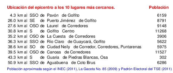 Mapa de la zona epicentral. Se muestran las poblaciones más cercanas al epicentro y fallas activas. Abajo están las distancias que hay del epicentro a cada uno de los diez sitios más cercanos y la cantidad de habitantes que poseen.