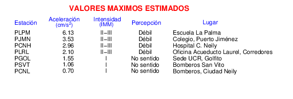 Intensidades en sitios de registro.Cada uno de los cuadrados en el mapa corresponde a la ubicación de un acelerógrafo al momento del sismo. Estos se muestran en distintos colores según la escala mostrada al pie de la figura.