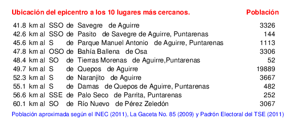 Mapa de la zona epicentral. Se muestran las poblaciones más cercanas al epicentro y fallas activas. Abajo están las distancias que hay del epicentro a cada uno de los diez sitios más cercanos y la cantidad de habitantes que poseen.
